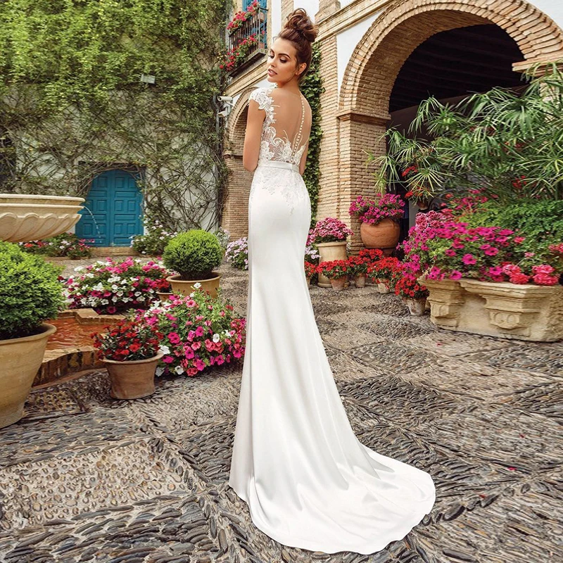 Элегантное прозрачное свадебное платье русалки с круглым вырезом 2021, кружевное платье невесты с коротким рукавом и аппликацией, изготовленное на заказ