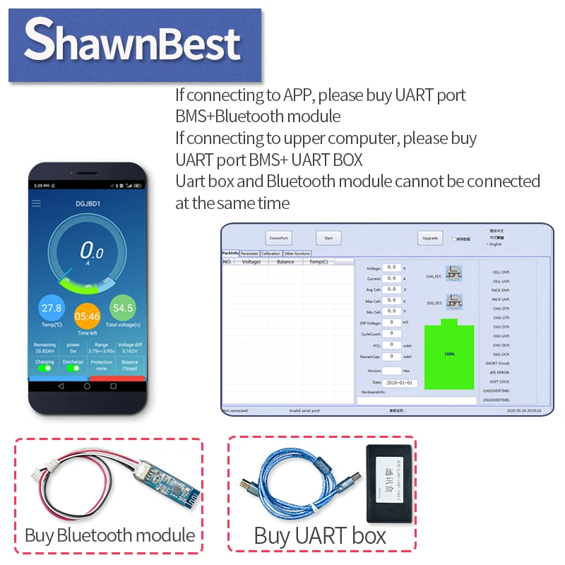 1. Если вам нужно подключить ваш мобильный телефон, вам нужно купить BMS с коммуникационная плата интерфейса UART порт или коммуникационная плата интерфейса UART порт, а затем добавить модуль bluetooth.2. Если вы Подключите компьютер только для чтения данных, вам нужно купить BMS, а затем добавить UART box,3. Примечание: модуль Bluetooth/UART box и ЖК-дисплей не могут быть использованы одновременно, из-за того, что они могут быть подключены только с одним общим портом
