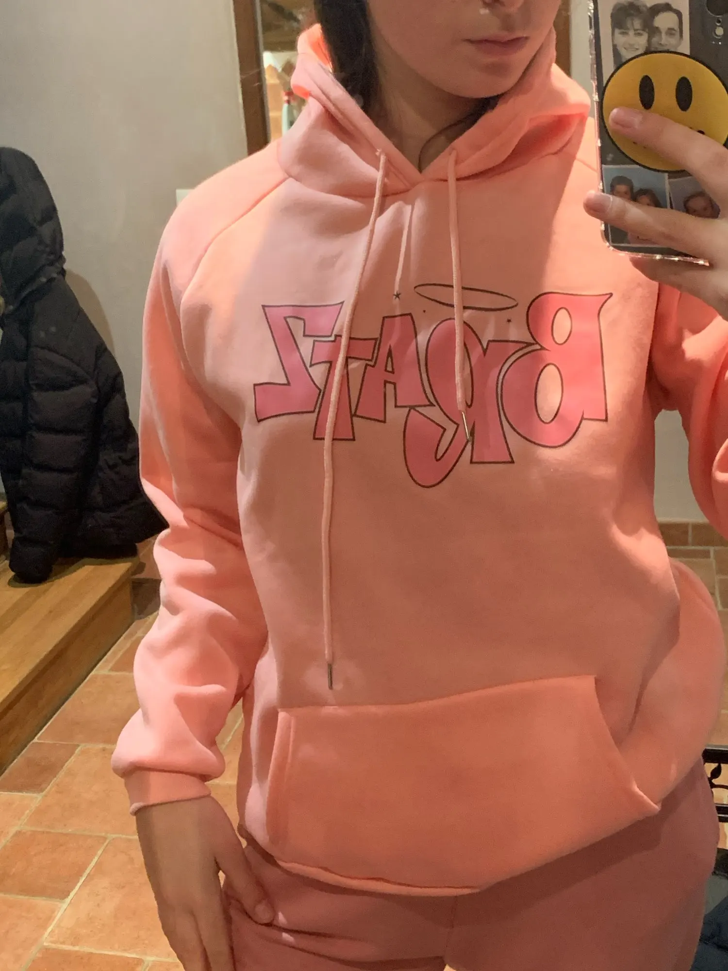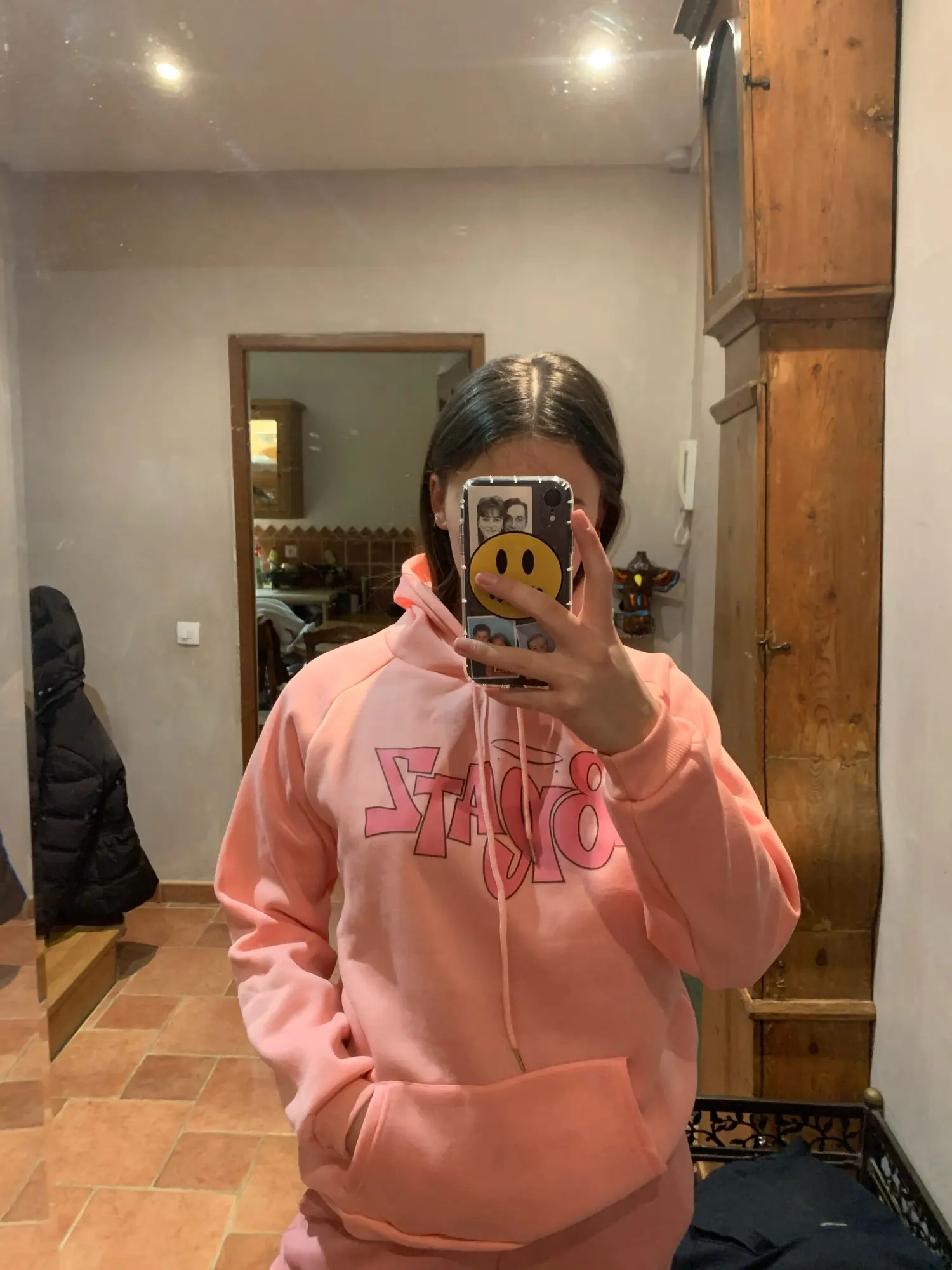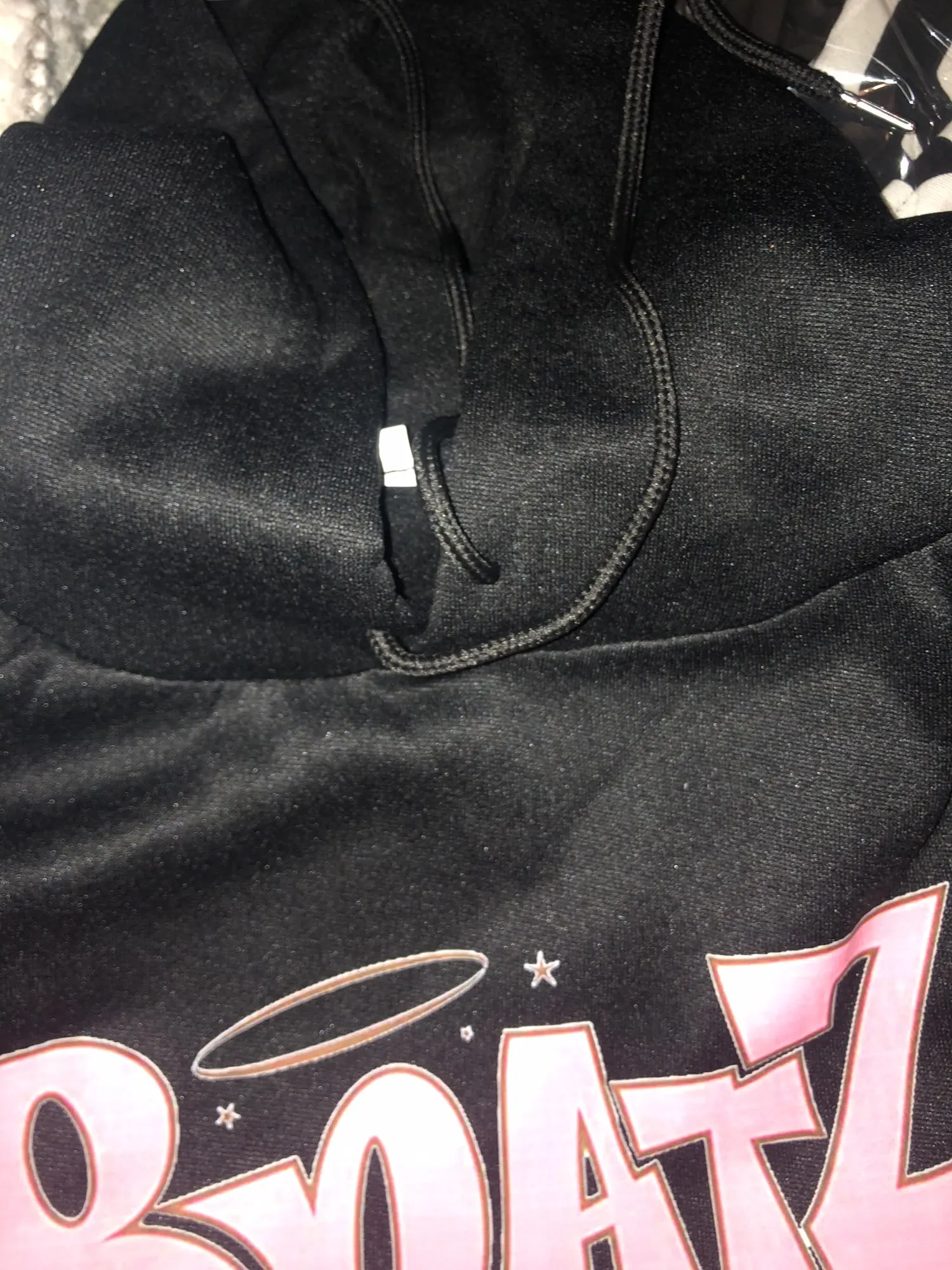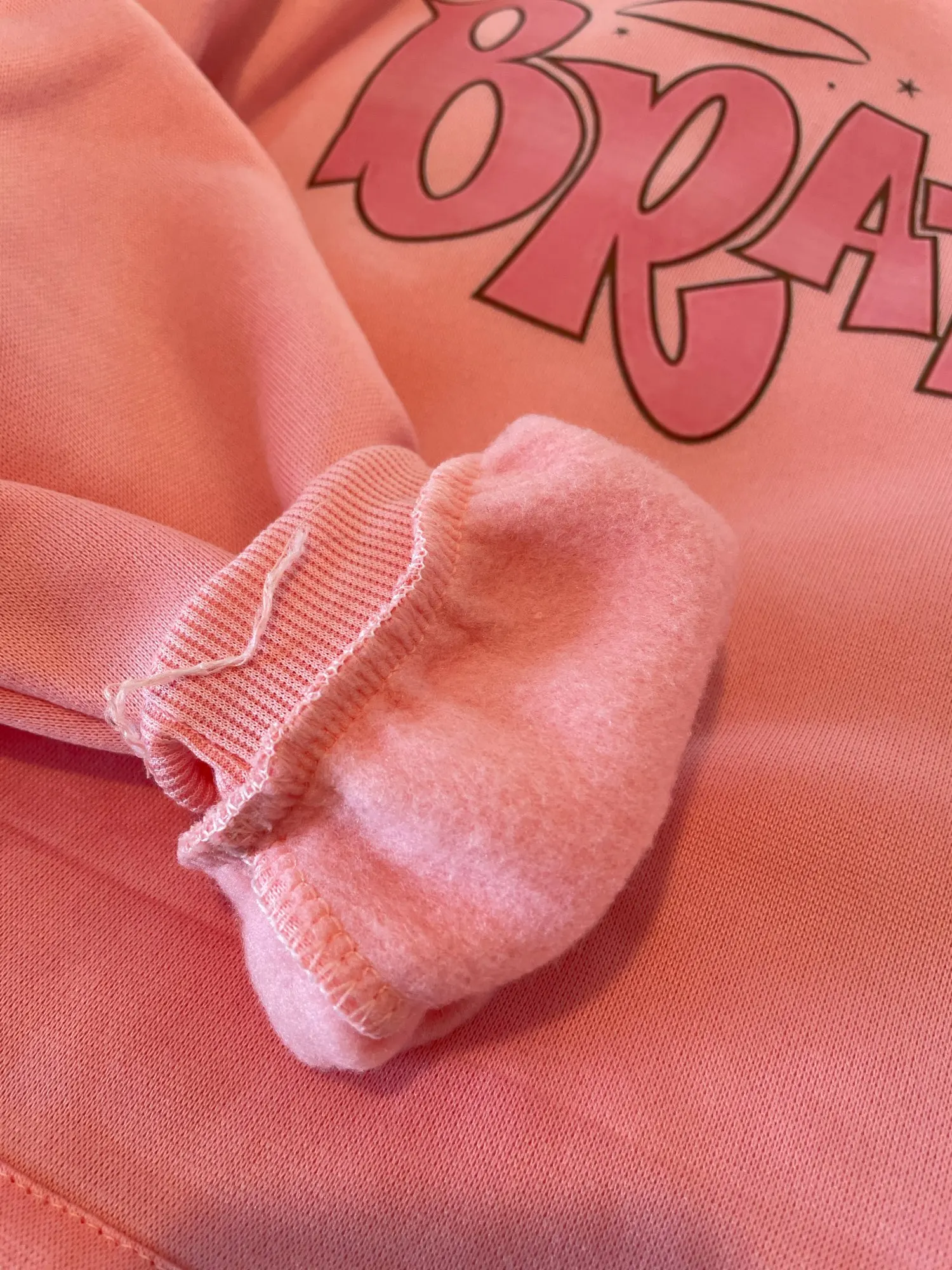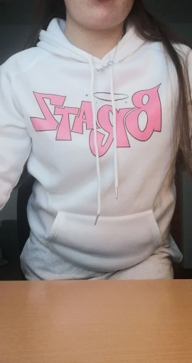 Толстовка выглядит как на фото, за исключением капель ниже, которая темнее розового цвета