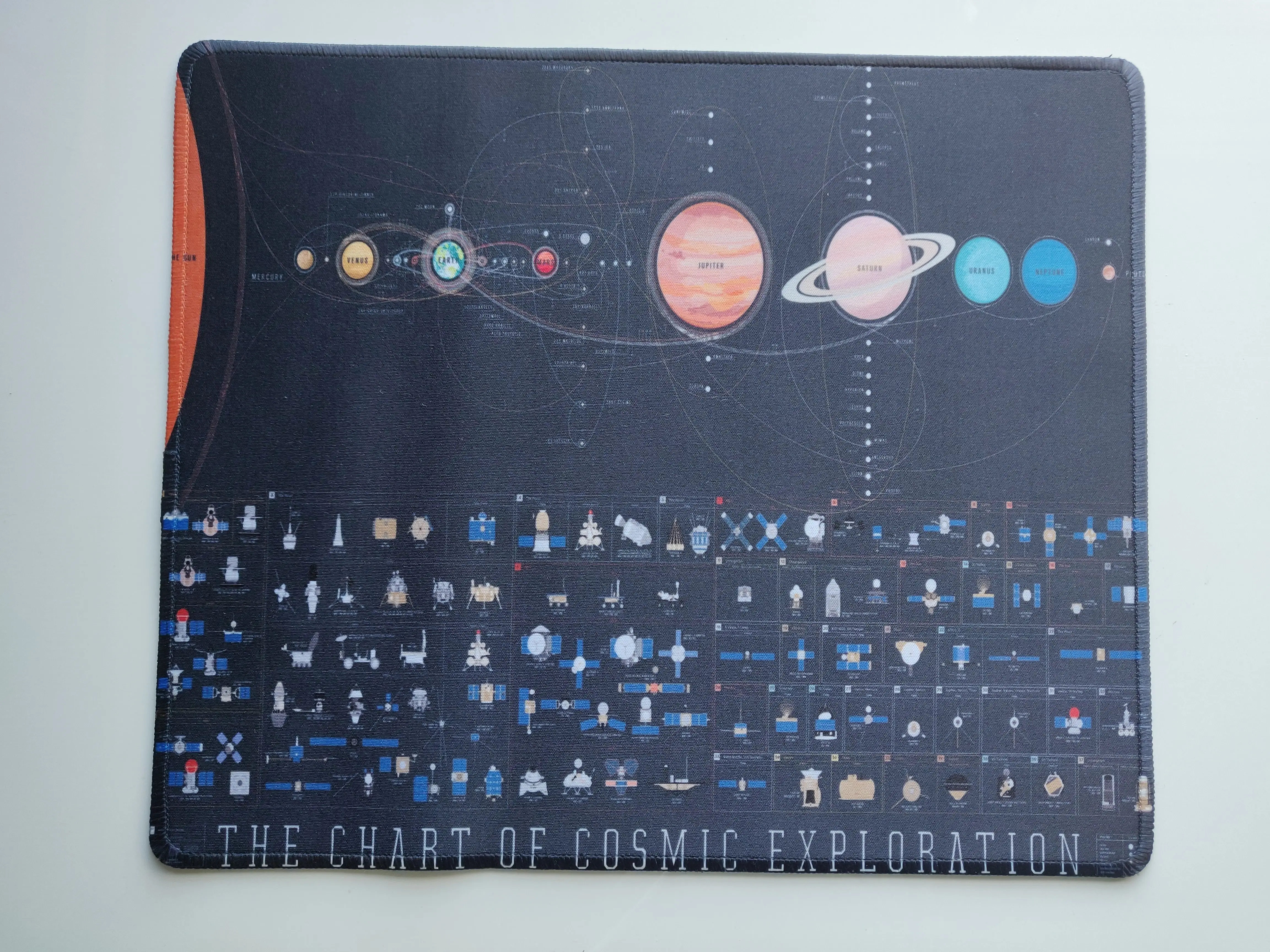 I bought the smallest one. Materials and print quality is acceptable for this price. Graphics was scaled without keeping proportions so it results in planets oval shape. Space ships are so small that all texts are unreadable - they should be actually removed by graphic designer. Rubber on the underside is ok - does not glide on the table but it does not stick to the table as well. Anyway, it is a mousepad and not the paint so after while you do not bother about the graphics.