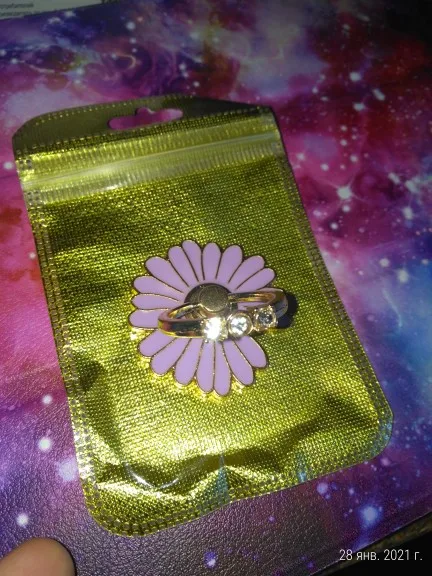 Колечко красивое, камешки блестят, настоящее украшение для телефона. Цвет нежно-лиловый, как раз к бамперу подошёл. Цветок металлический, не пластик. Кольцо не очень тугое, клеевая основа не пена, а прозрачная, как силикон (по личному опыту, такая лучше). В красивом золотом конвертике, хоть на подарок. Пришла посылка в консолидированном пакете на новую почту, недели за 2. Дочке понравится. Возьму и себе такой,в другом цвете.