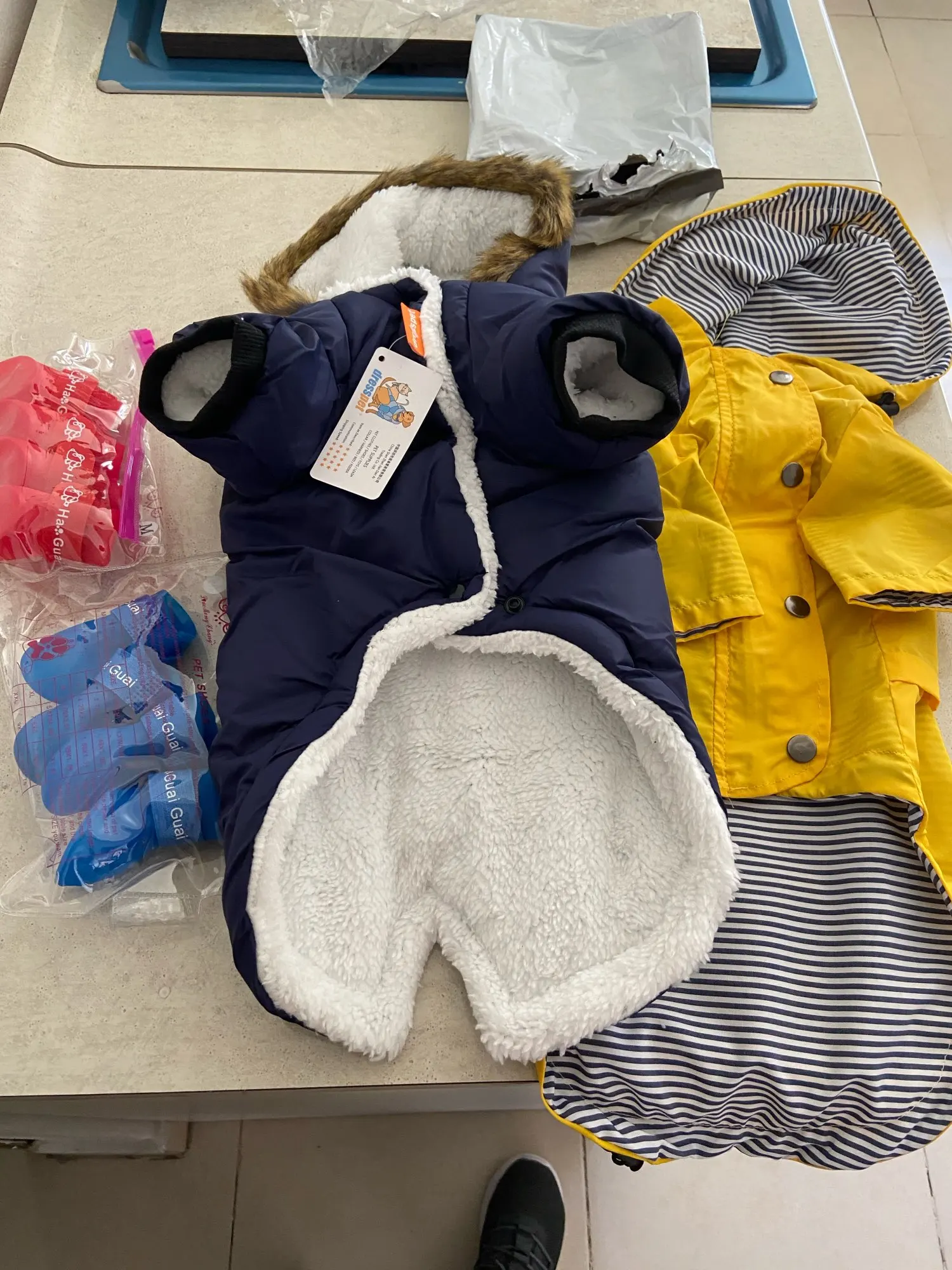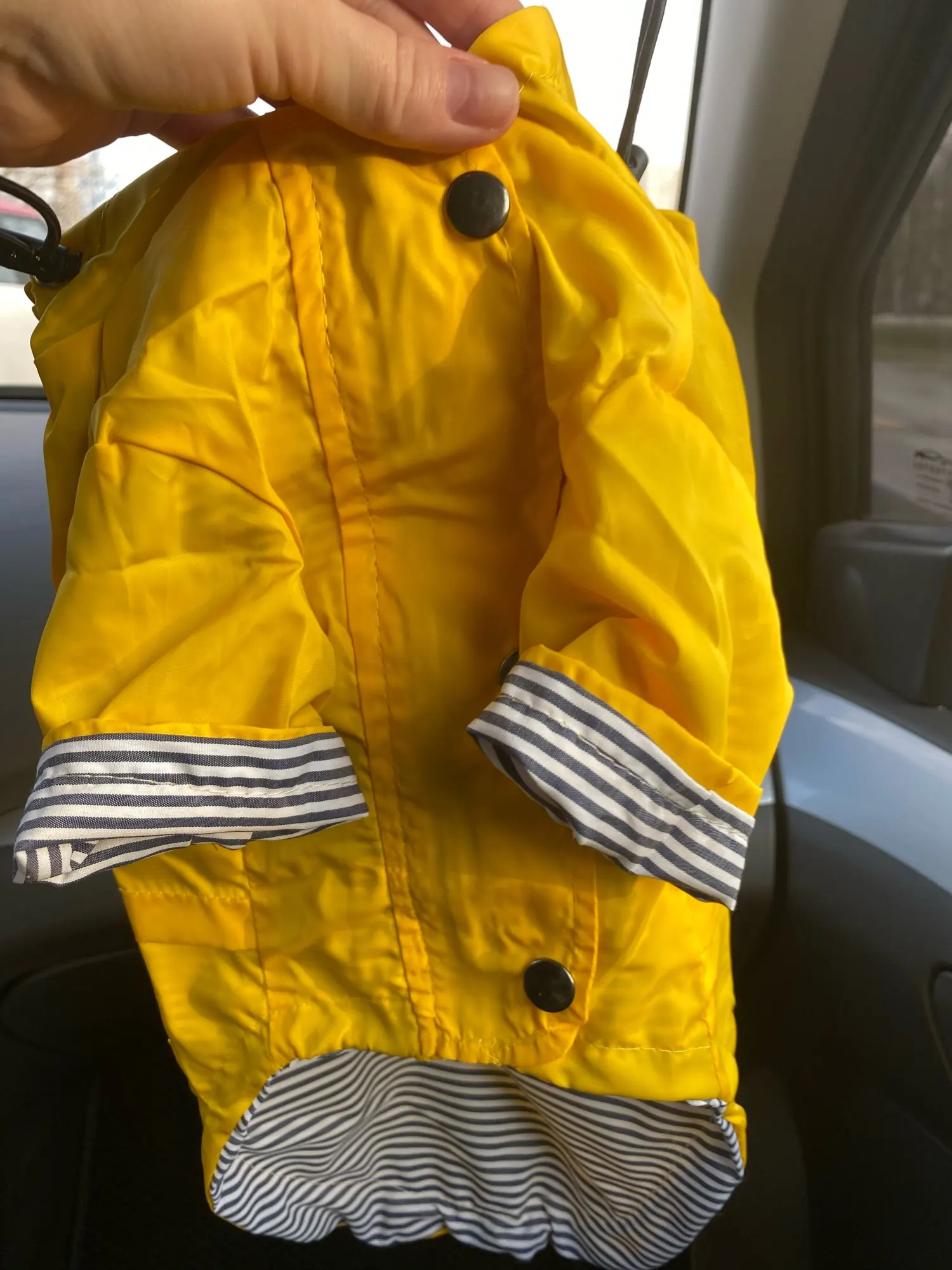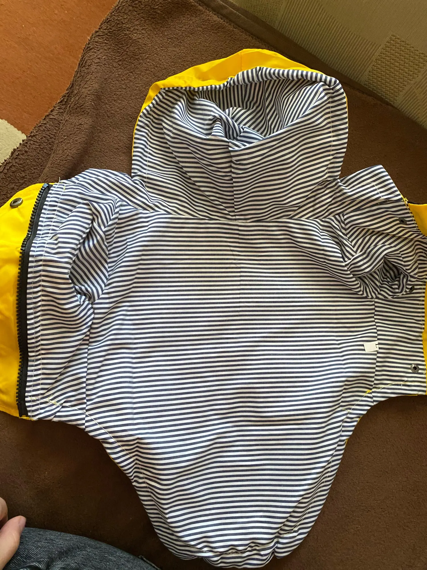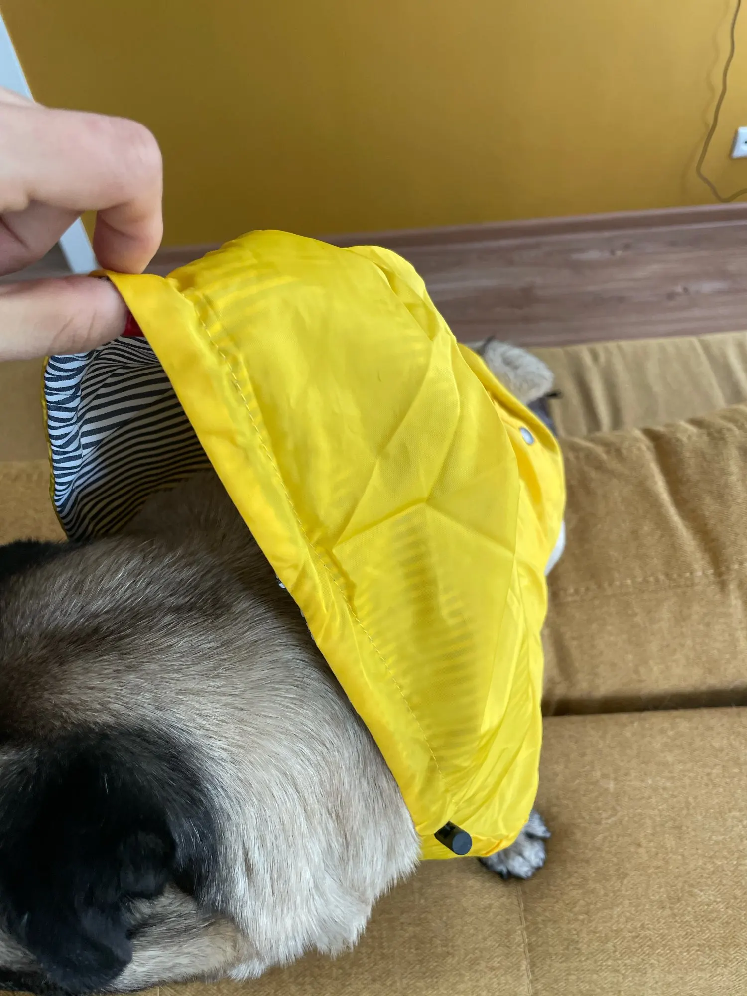 Очень клевая курточка. Сидит отлично, брала на мопса - 8кг - грудь 50см, шея 33см, спина 45см - ххл. Но на фото не совсем понятно, что ткань верхняя просвечивается, я ожидала другое качество ткани - на фото кажется ткань плотная, как целофан, клеенка - но верхняя ткань тоненькая и просвечивает полосатую подкладку. Пошито хорошо, качественно, аккуратно. Смотрится супер. Капюшон большой. Very cool jacket. Sits perfectly, took on a pug - 8kg - chest 50cm, neck 33cm, back 45cm - xхl. But in the photo it is not entirely clear that the upper fabric is translucent, I expected a different quality of the fabric - in the photo it seems the fabric is dense, like cellophane, oilcloth - but the upper fabric is thin and the striped lining shines through. Sewn well, high quality, neat. It looks super. The hood is large.