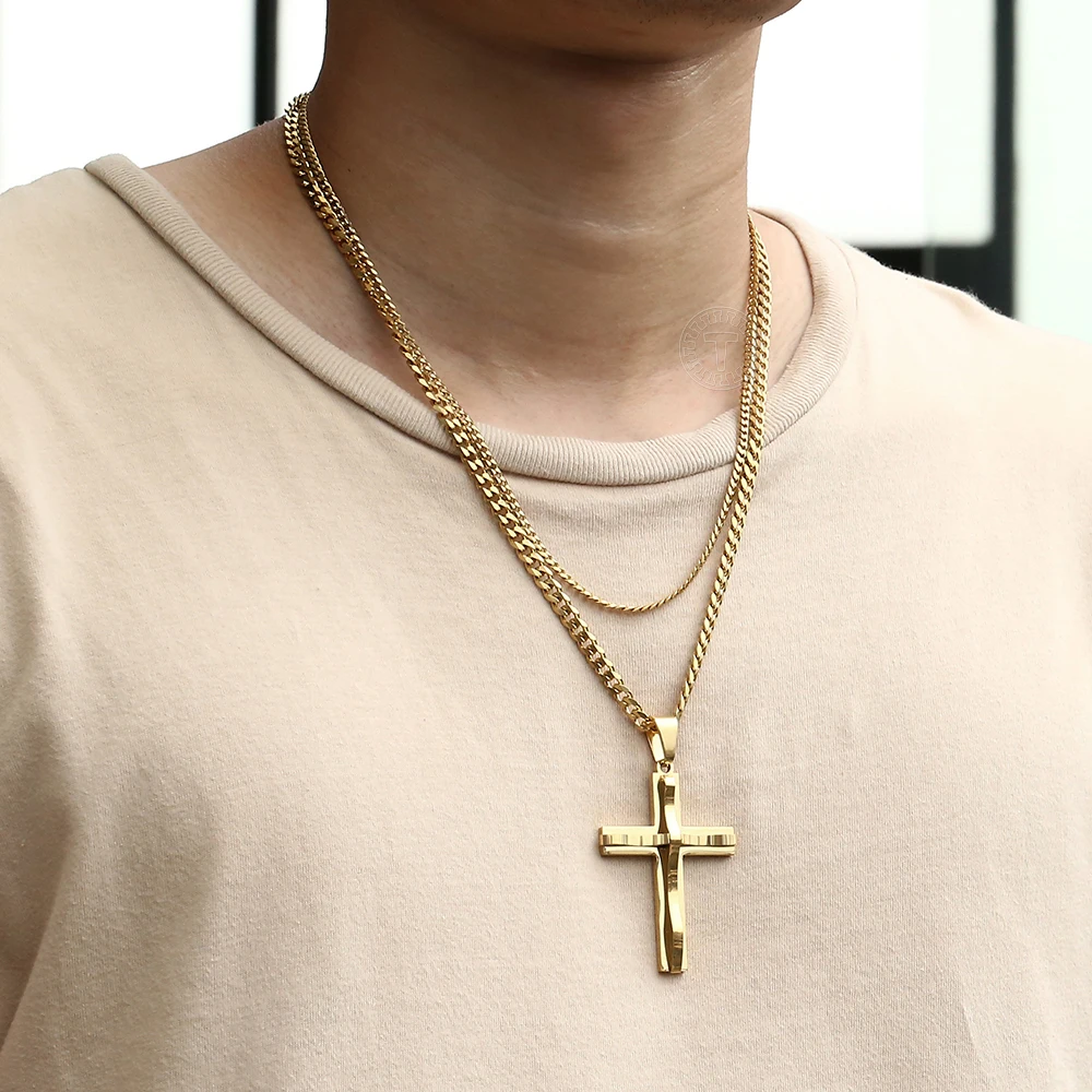 Золотой цвет двойные цепи крест кулон ожерелье для мужчин женщин коробка Снаряженная кубинское ожерелье из нержавеющей стали ссылка ювелирные изделия DKP602KN195