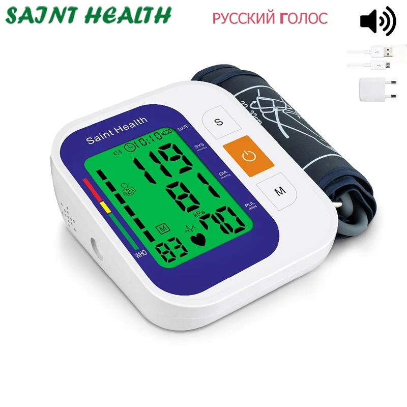 Тонометр с русским голосовым сопровождением, с подсветкой, электрический цифровой измеритель артериального давления, сфигмоманометр, пульсометр, измеритель пульса