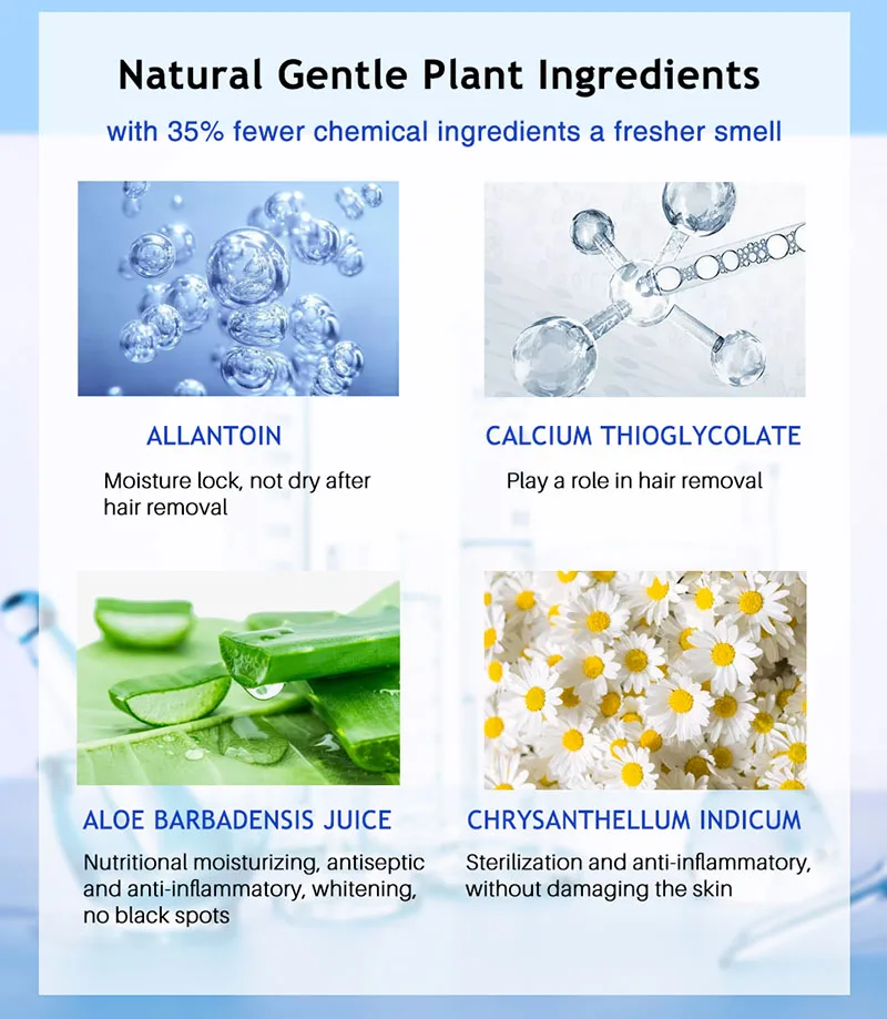 Ключевые моменты:1. Встряхните перед использованием; 2. Нанесите толщину крема; 3. Время удаления волос.