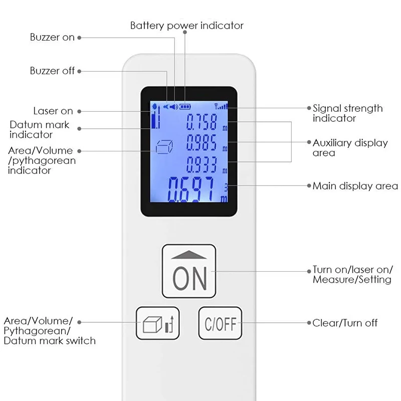 Более высокая точность: индикатор для измерения отметки данных/уровня заряда батареи/зуммера/силы сигнала. Быстрое измерение расстояния, площади и объема с простой работой, диапазон измерения 30 м и высокая точность: ± 3 мм. Улучшенная работа: удобный и компактный дизайн обеспечивает отличный ручной опыт работы, ЖК-дисплей с подсветкой для легкого и четкого чтения. Легкое Таргетирование с яркой лазерной указкой. Несколько режимов измерения: расстояние/площадь/объем/один/Макс и мин/Непрерывное измерение и 3 вида непрямого измерения по теореме Пифагора. Поставляется с ручным ремешком и портативным дизайном, удобным для переноски. Различные настройки: 3 единицы измерения: m/in/ft, индикатор buzzer, ручное выключение питания/автоматическое выключение 45s без работы и функция автоматического отключения лазера 15s. Супер Мини карманный размер для портативного использования. Широкое применение: Может использоваться в строительстве и промышленности, особенно в больших областях, таких как комнаты, квартиры, здания, недвижимость, фабрики, склады и т. Д.