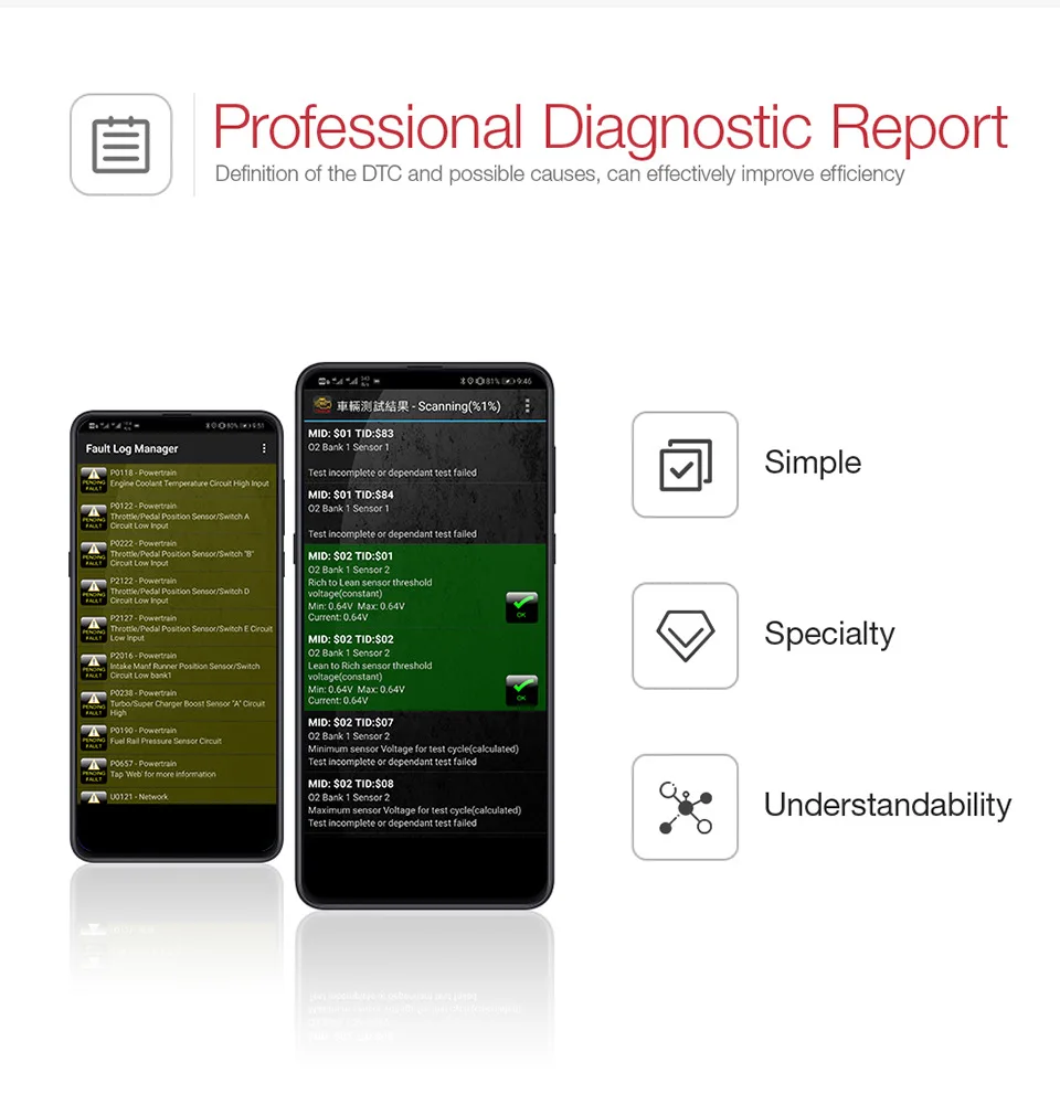 Чтение диагностических кодов неисправностей, как общих, так и конкретного производителя, и вывод их значений. (определения более 3000 общих кодов в базе данных).