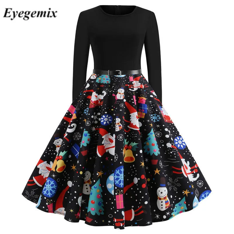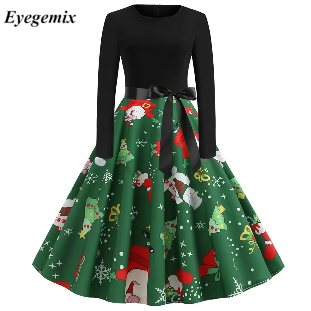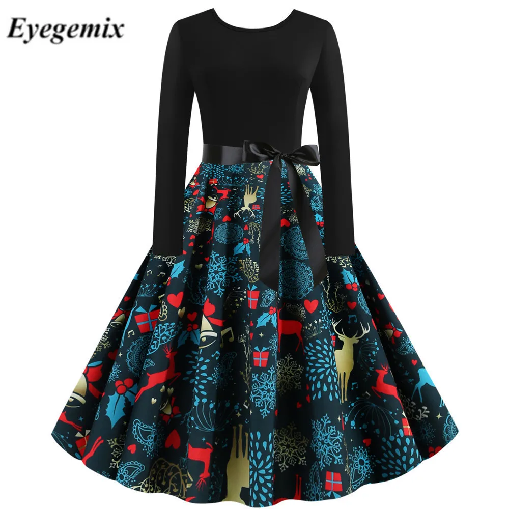 Женское рождественское платье с цветочным рисунком, зимнее элегантное винтажное платье с длинным рукавом и бантом на спине, женское платье для рождевечерние
