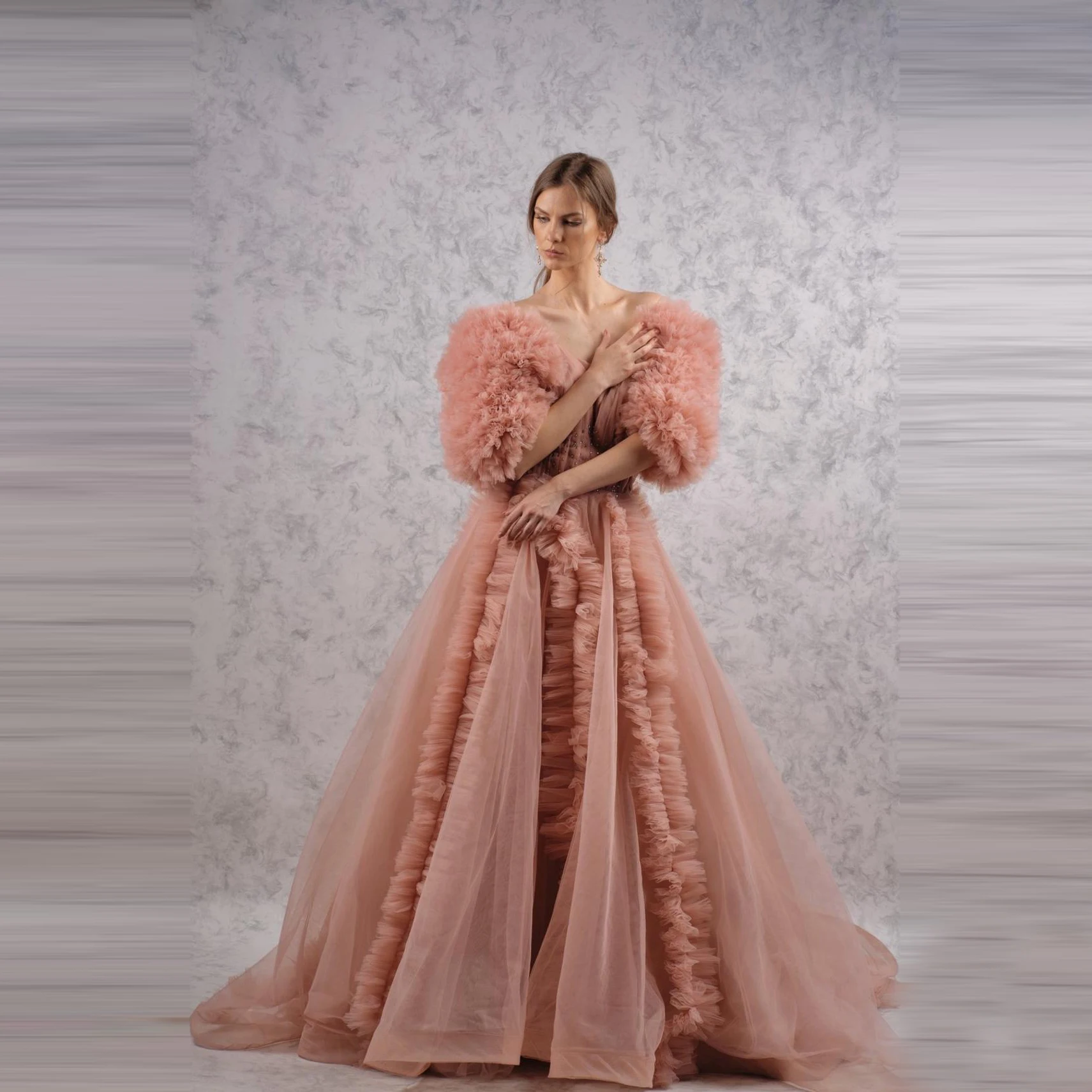 Пышные розовые тюлевые платья, пышные рукава, а-силуэт, длинные женские вечерние платья-Макси, платья из органзы, рождественские тюлевые платья