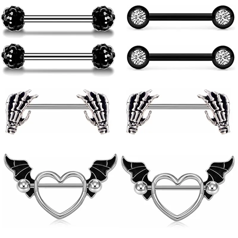 Пирсинг для сосков в форме сердца из нержавеющей стали, набор для пирсинга дюйма, 14 г, в виде черных крыльев Ангела, штанга для языка, оптом, кольцо для сосков с кристаллами, упаковка