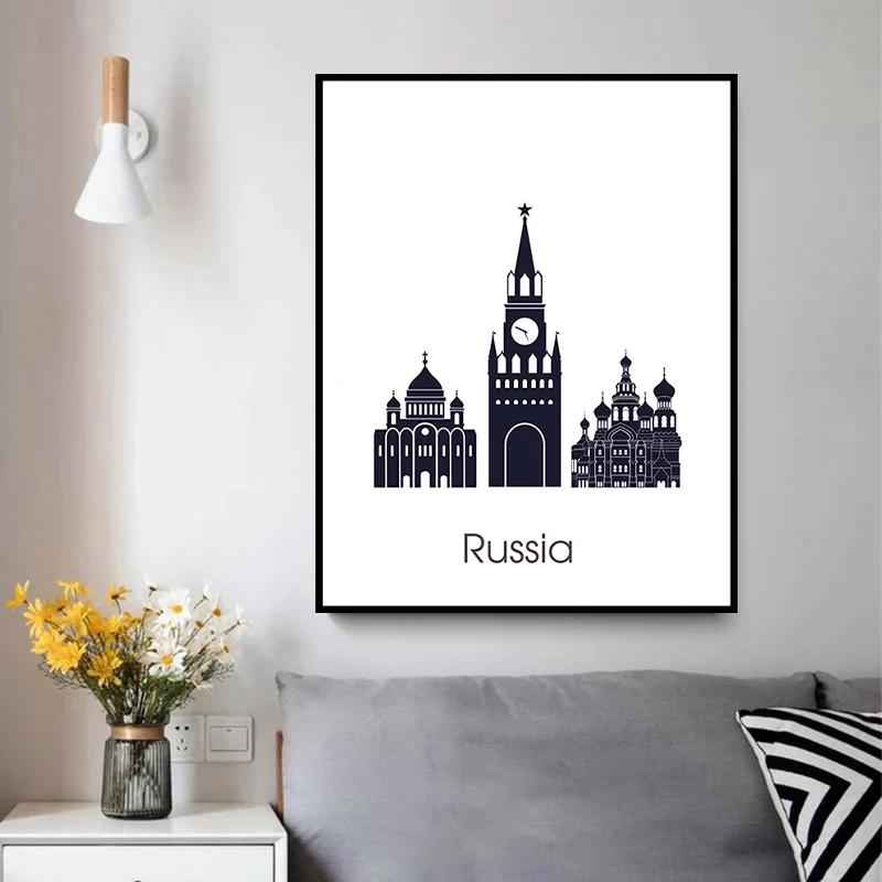 Плакат с изображением России, Москвы, города, путешествий, черно-белый минималистский рисунок на холсте, настенное украшение для комнаты