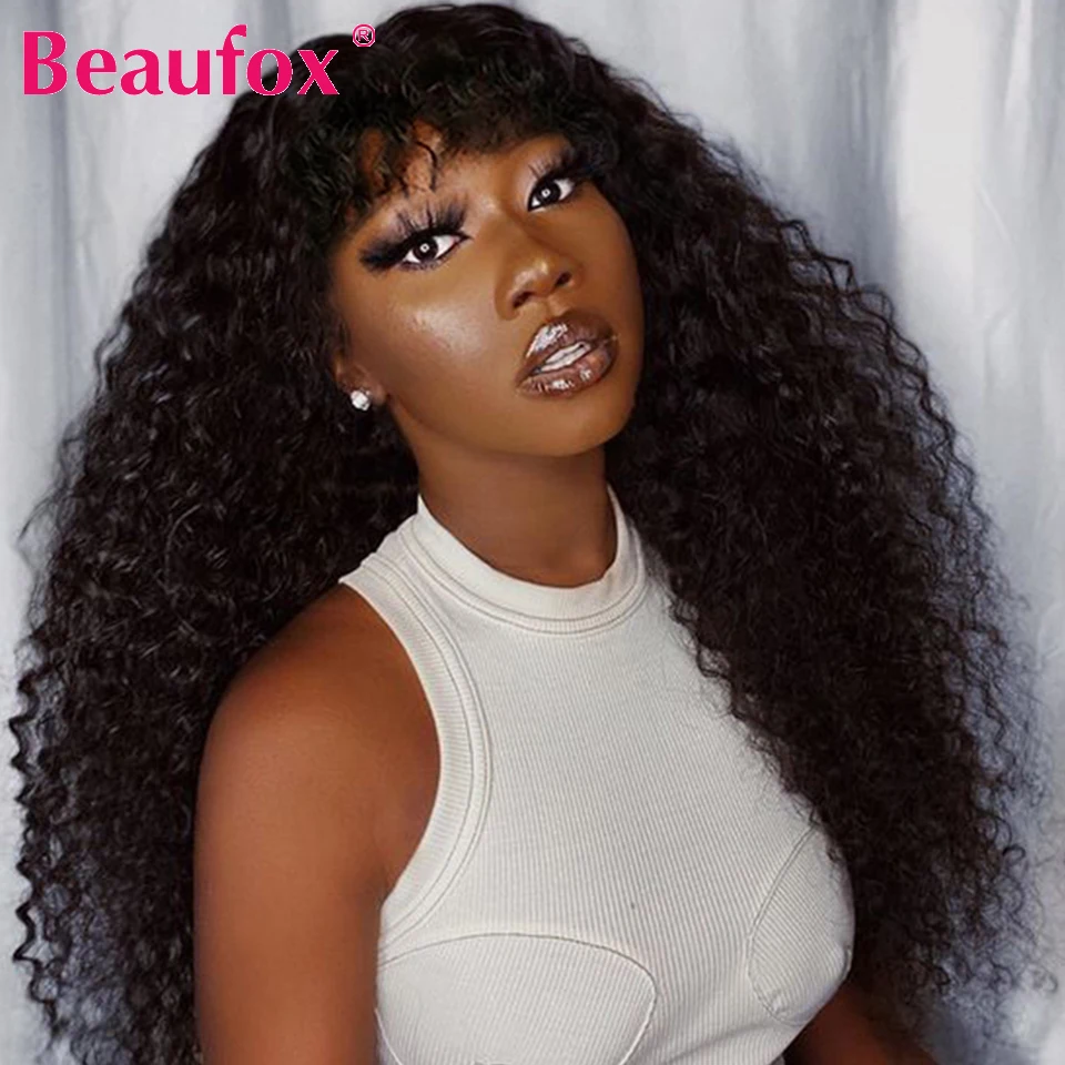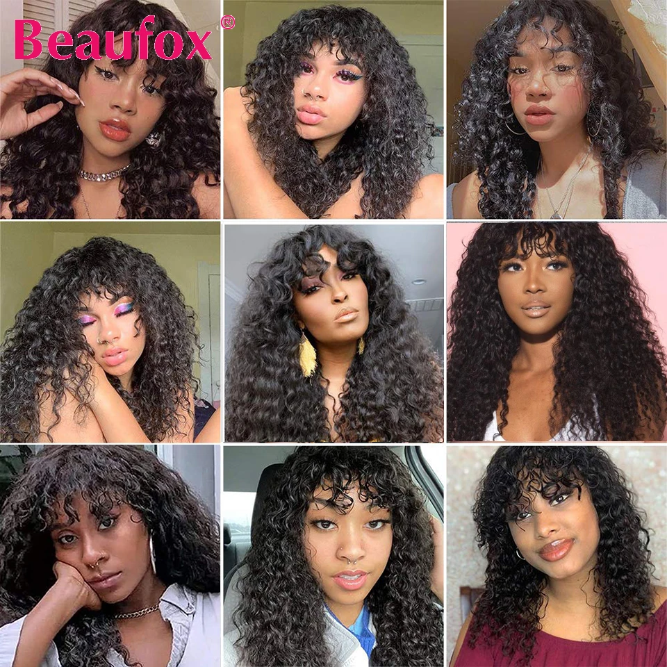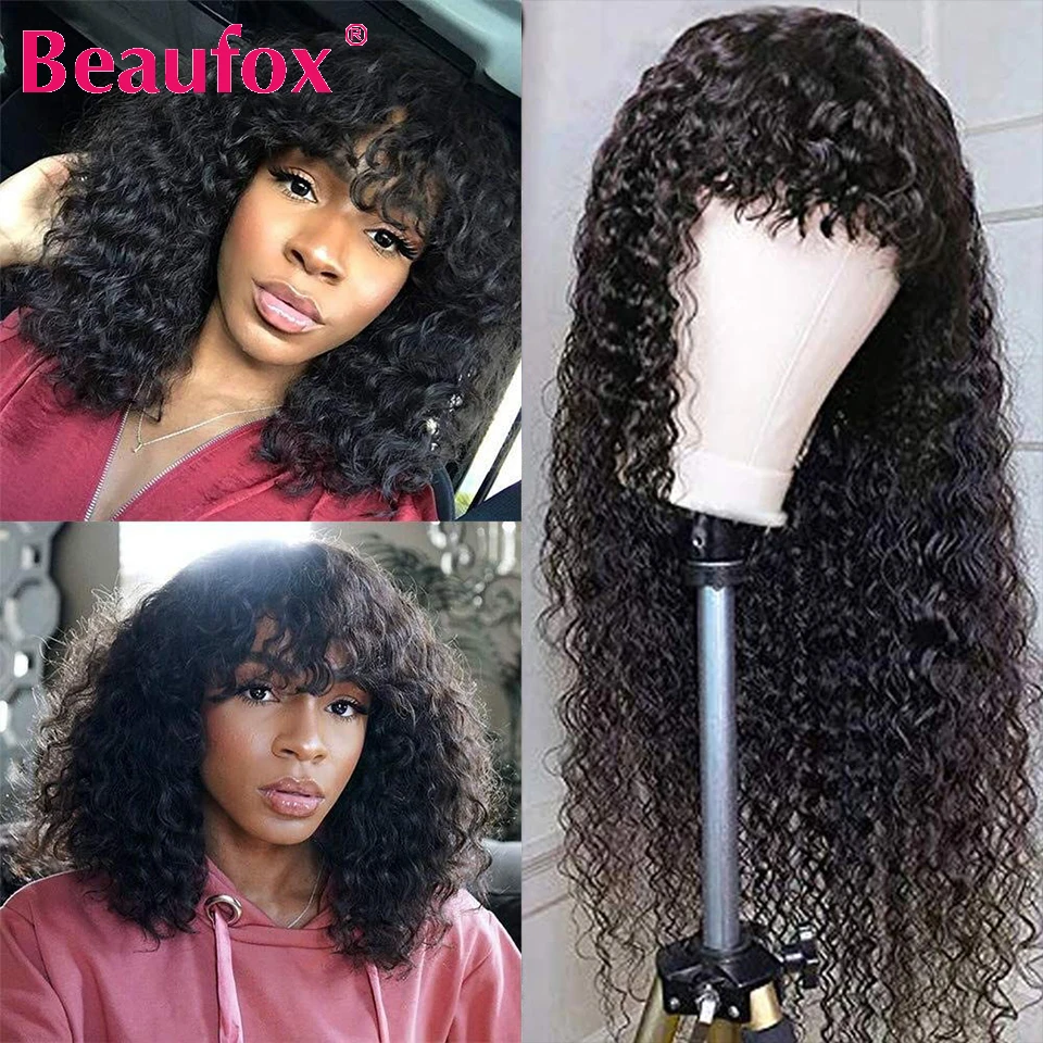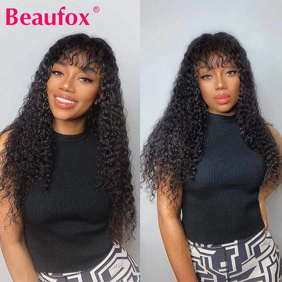 Парики Beaufox с волнистой волной и челкой для чернокожих женщин, малазийские человеческие волосы, парики без клея, полностью машинный человеческий парик с челкой Remy