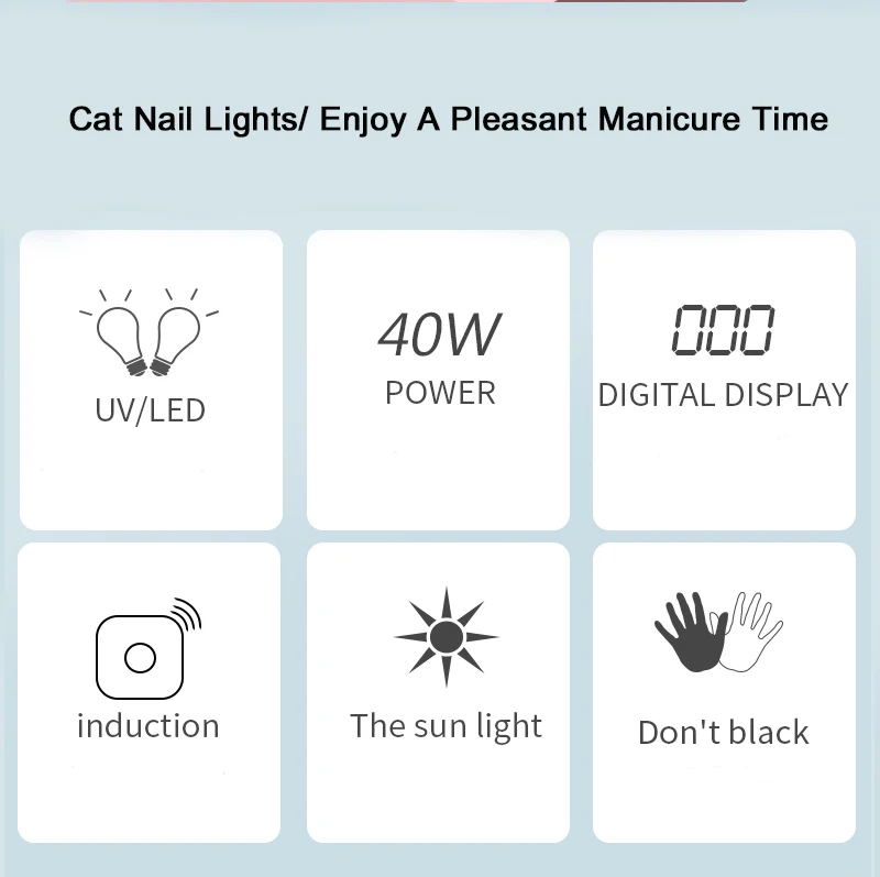 Характеристики:Тип: инструмент для ухода за ногтямиМодель: светильник для кошкиМатериал: АБС-пластик + ПоликарбонатЦвет: как показаноТип разъема: USBАдаптер Вход: переменный ток 100-240V 50/60HZ 1AМощность: 40 ВтФункция: автоматическое распознаваниеНастройка времени: 30s 60s 99sОсновной атрибутРазмер: 197*154*100 ммНапряжение: 100-240V 50/60HZ 1AВес: 240 гБусины лампы: 20 шт.Срок службы: 50000 часовКоличество бусин: 20 ламп равномерно распределеныОсобенности 1: Светодиодный УФ для сушки ногтейОсобенности 2: нет вреда для глаз и кожиОсобенности 3: двойной светильникОсобенности 4: Автоматическое определение Посылка:1 * кошачий светильник для ногтей1 * USB Примечание: Не используйте кислотные жидкости для очистки поверхности шарика лампы. В противном случае лампы могут обесцвечиваться!