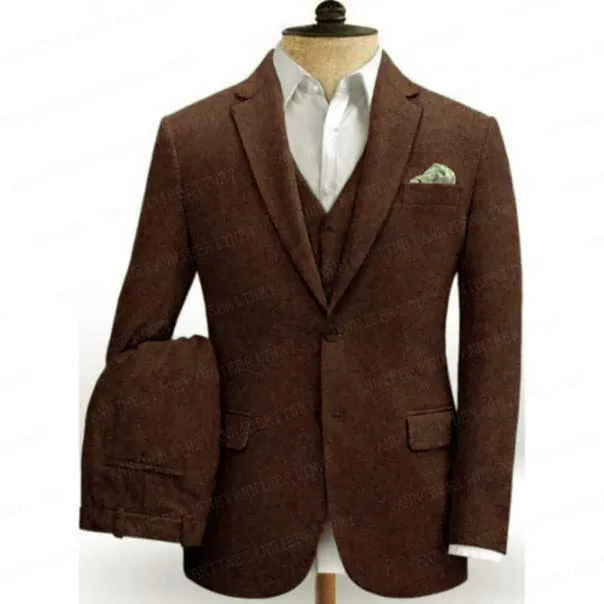 Брендовые последние классические коричневые мужские костюмы твид 3 шт на заказ Жених Свадебный или Выпускной костюм смокинг Зимний деловой Блейзер жилет брюки