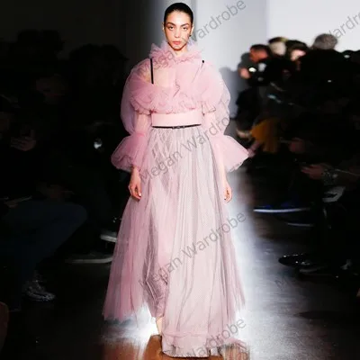 Новое дизайнерское милое розовое прозрачное фатиновое платье для женщин с длинными рукавами, длинное платье для выпускного вечера, гофрированное Тюлевое платье с воротником под заказ