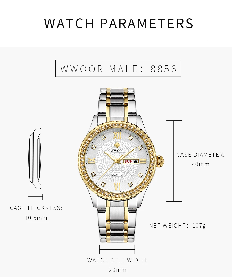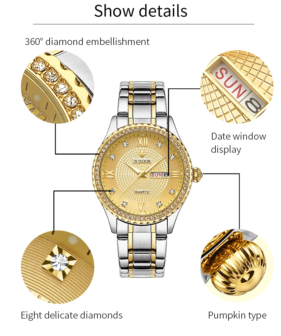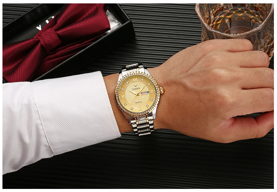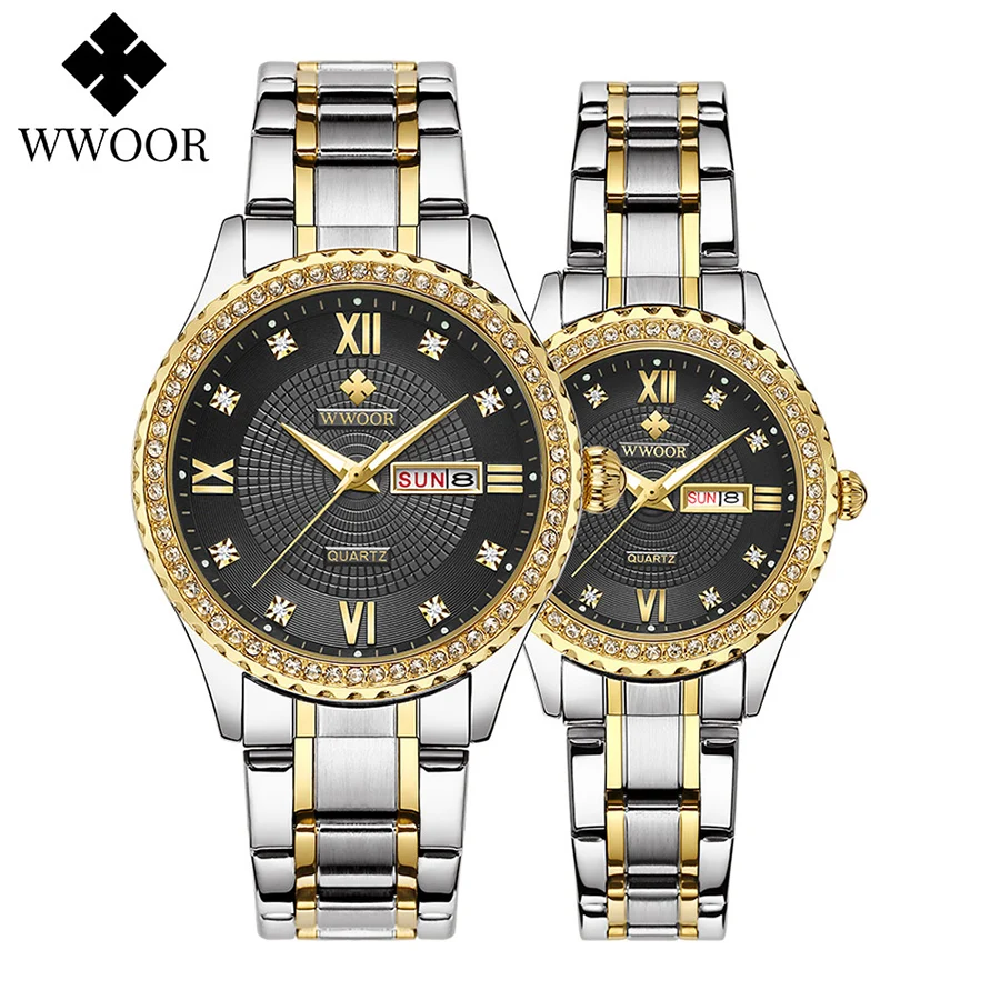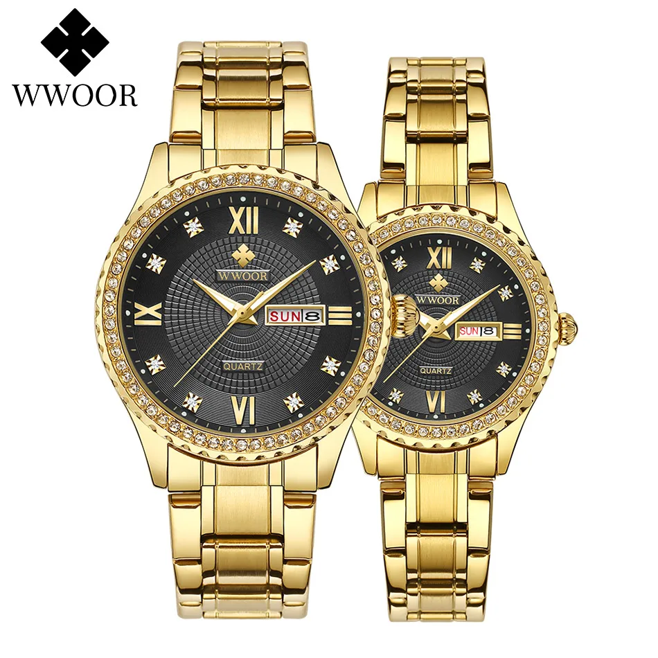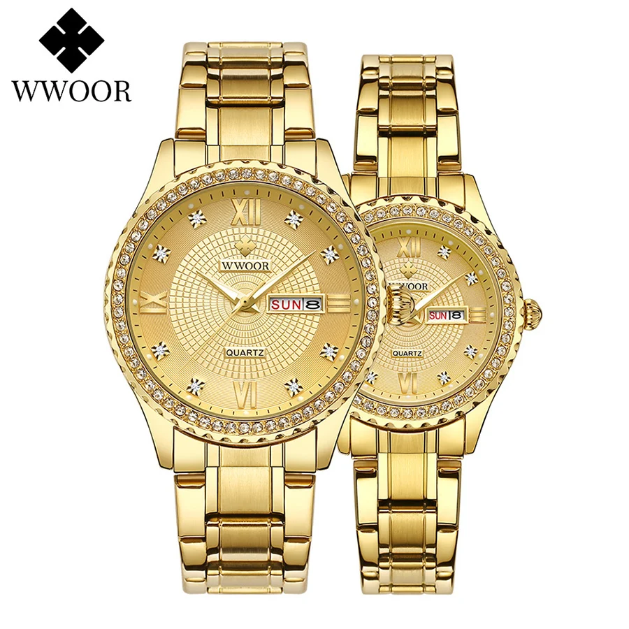WWOOR роскошные золотые парные часы лучший бренд Кварцевые водонепроницаемые наручные часы Стильные бриллианты для мужчин женщин мужчин часы в подарок Relogios Casais