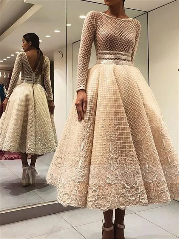 С длинным рукавом Чай Длина Выходные туфли на выпускной Платья для вечеринок Champagne Puffy Формальные Короткое вечернее платье с аппликацией из кружева с открытой спиной