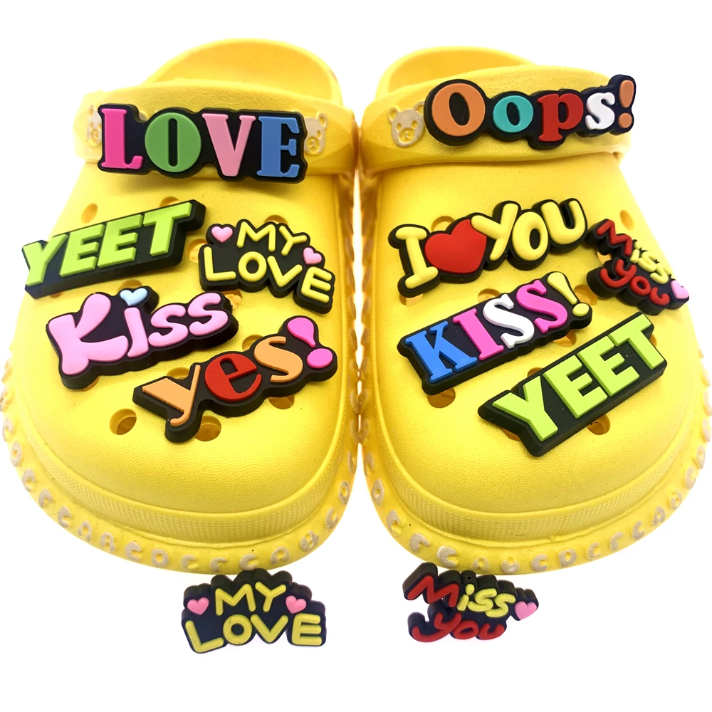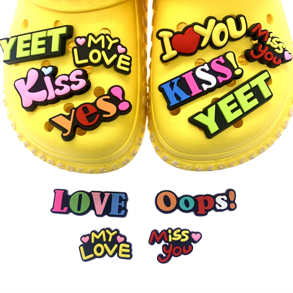 Оптовая продажа, 50 шт., оптовая продажа, смешанные силиконовые украшения для обуви, Мультяшные английские фразы, Кроксы, подвески, разноцветные буквы, аксессуары