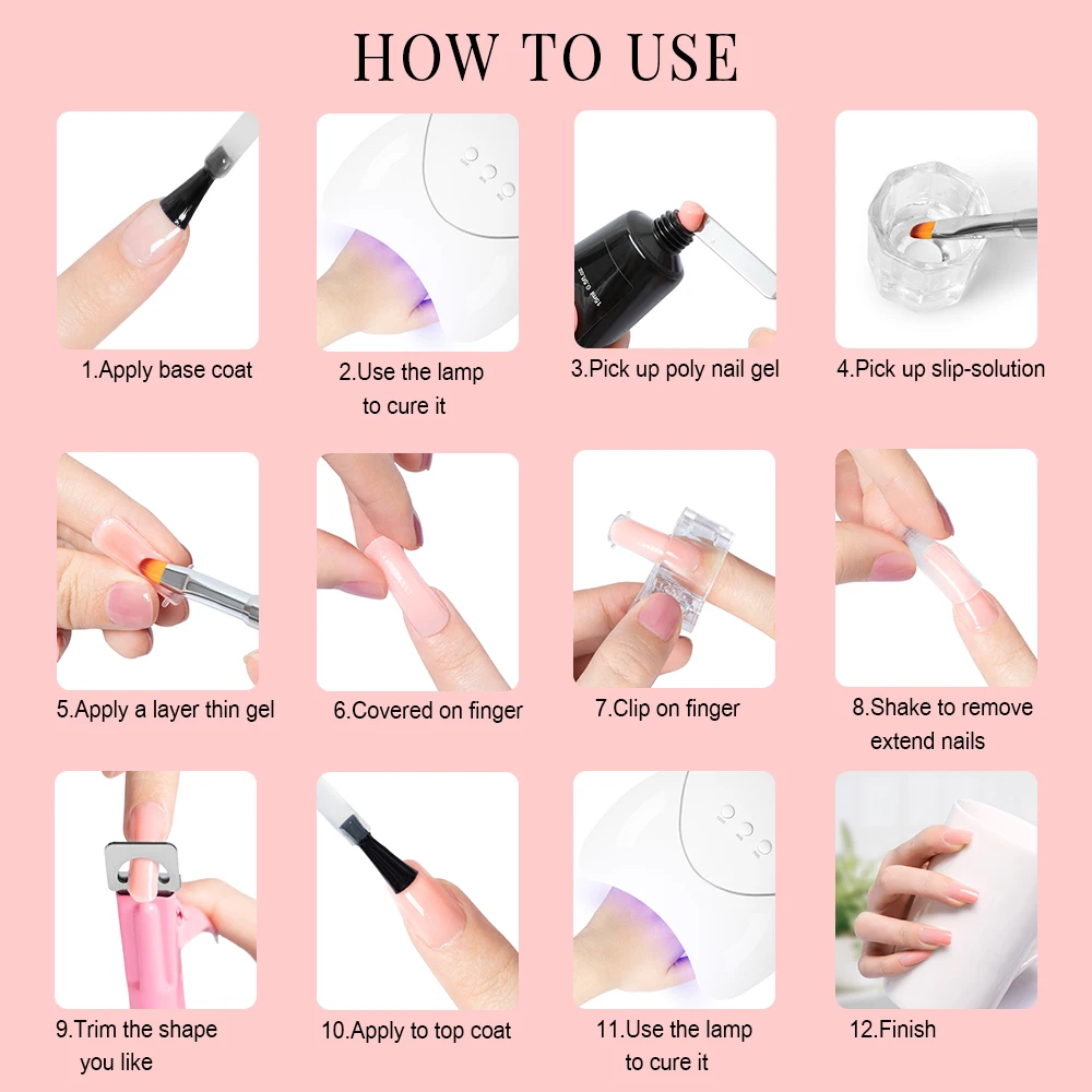 1. Обрежьте поверхность ногтей, очистите и высушите ногти.2. Нанесите очень тонкий слой базового покрытия и закрепите его под УФ/светодиодной лампой.3. Выберите подходящую форму и размер накладных ногтей.4. Нанесите поли гель для ногтей на накладные Кончики ногтей, используйте ручку для дизайна ногтей с раствором для скольжения, чтобы сделать гель гладким.5. Приклейте его к реальному ногтю и убедитесь, что он полностью разрастается, и высушите его под УФ/светодиодной лампой.6. Удалите накладные Кончики ногтей, обрежьте форму и отполируйте ногти.7. Нанесите верхнее покрытие и закрепите его под УФ/светодиодной лампой.