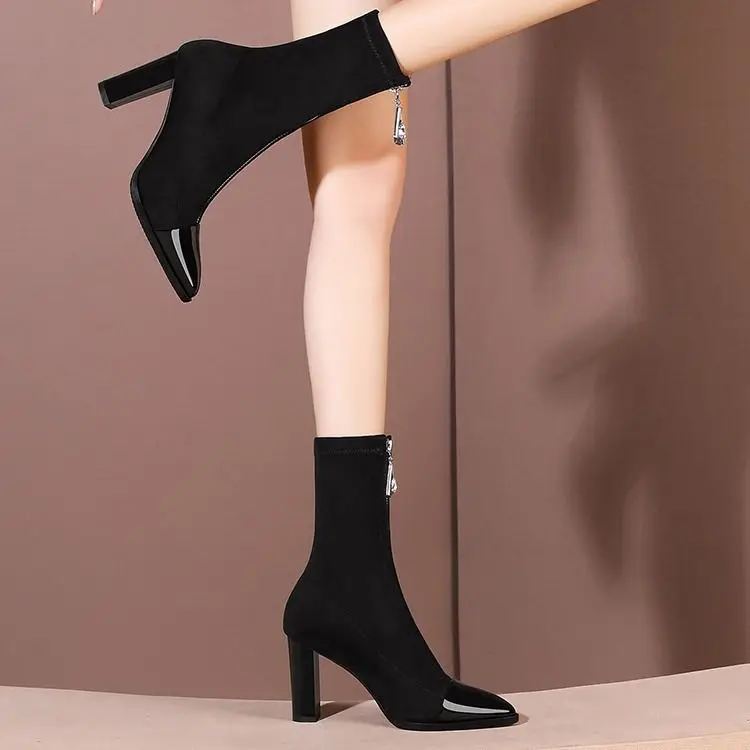 Женские короткие ботинки на толстом каблуке, Новые осенне-зимние ботинки с острым носком на среднем каблуке, черные ботинки, 2020 тонкие эластичные ботинки