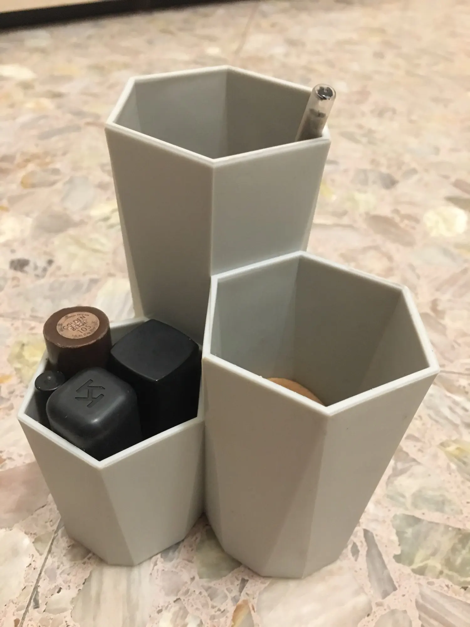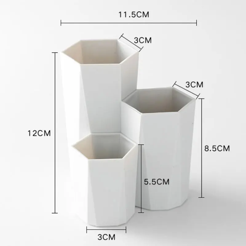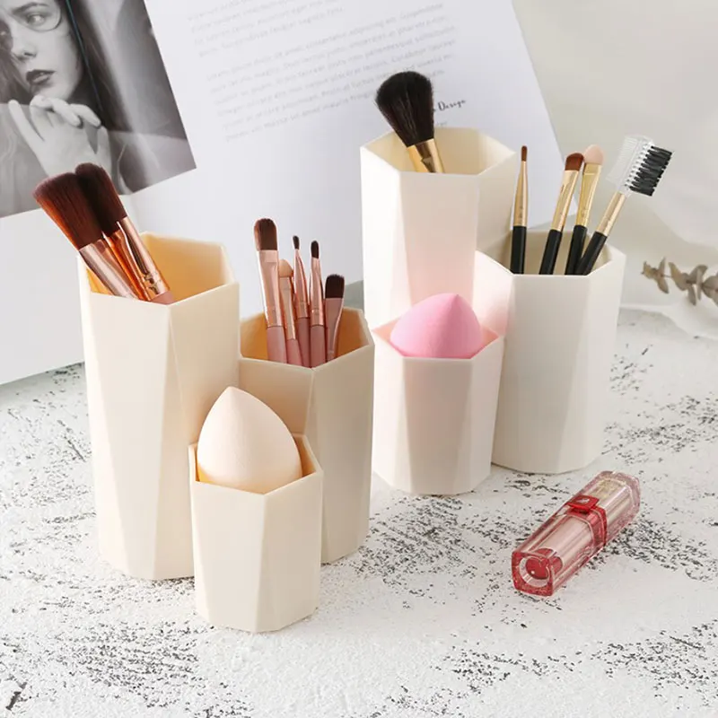 Особенности:1. Высокий и низкий, уровень четкий.2. 3 цилиндра в одном, классифицированные и упорядоченные.Высокая трубка: подходит для хранения длинных щетокСредняя трубка: можно положить кисть или другуюКороткий тюбик: можно разместить косметические яйца, лак для ногтей и т. д.3. Материал PS, прочный и долговечный.4. Шестигранный дизайн, хранение текстуры.