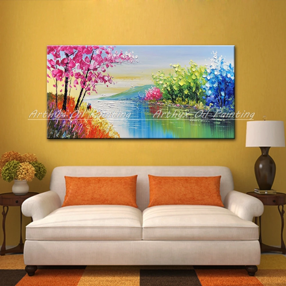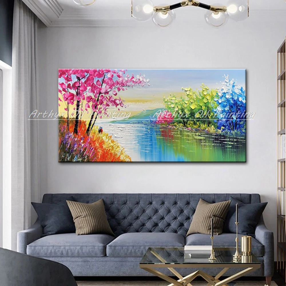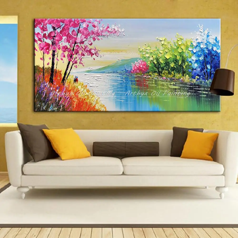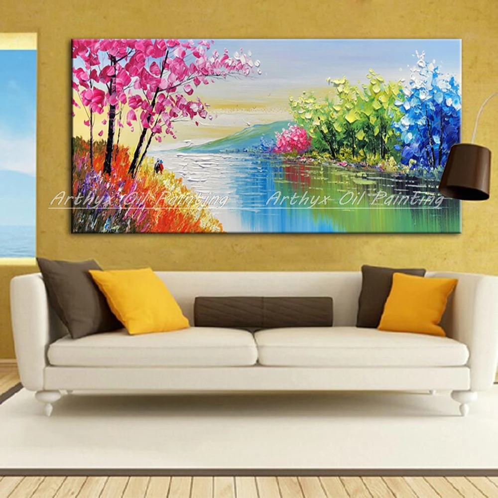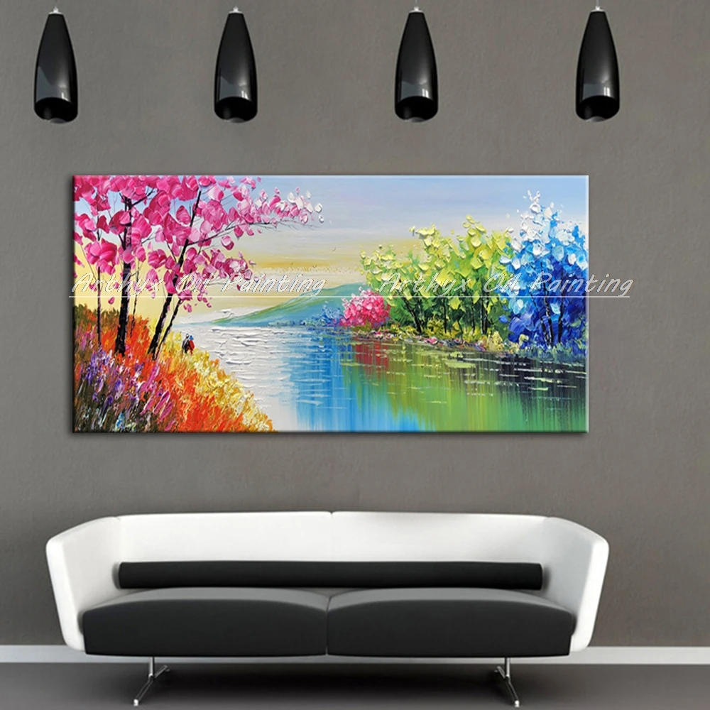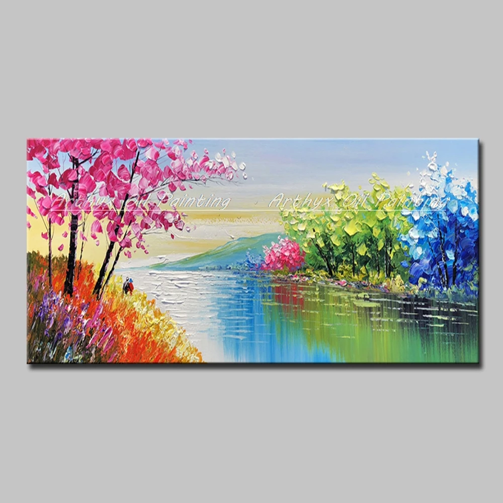 Arthyx Hand Painted Palette Knife River Landscape Oil Painting On Canvas Modern Art Wall Picture For Living Room Home Decoration