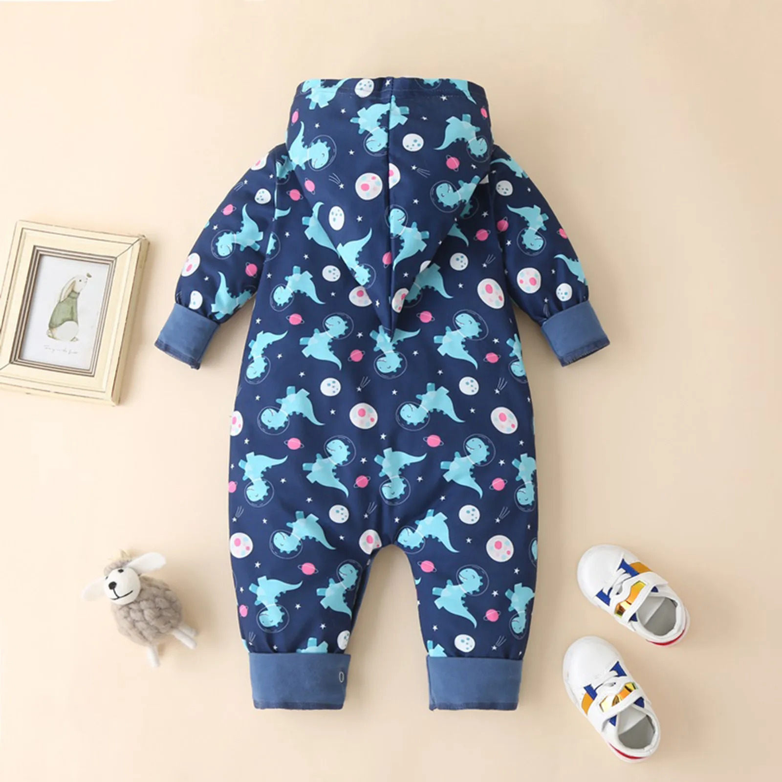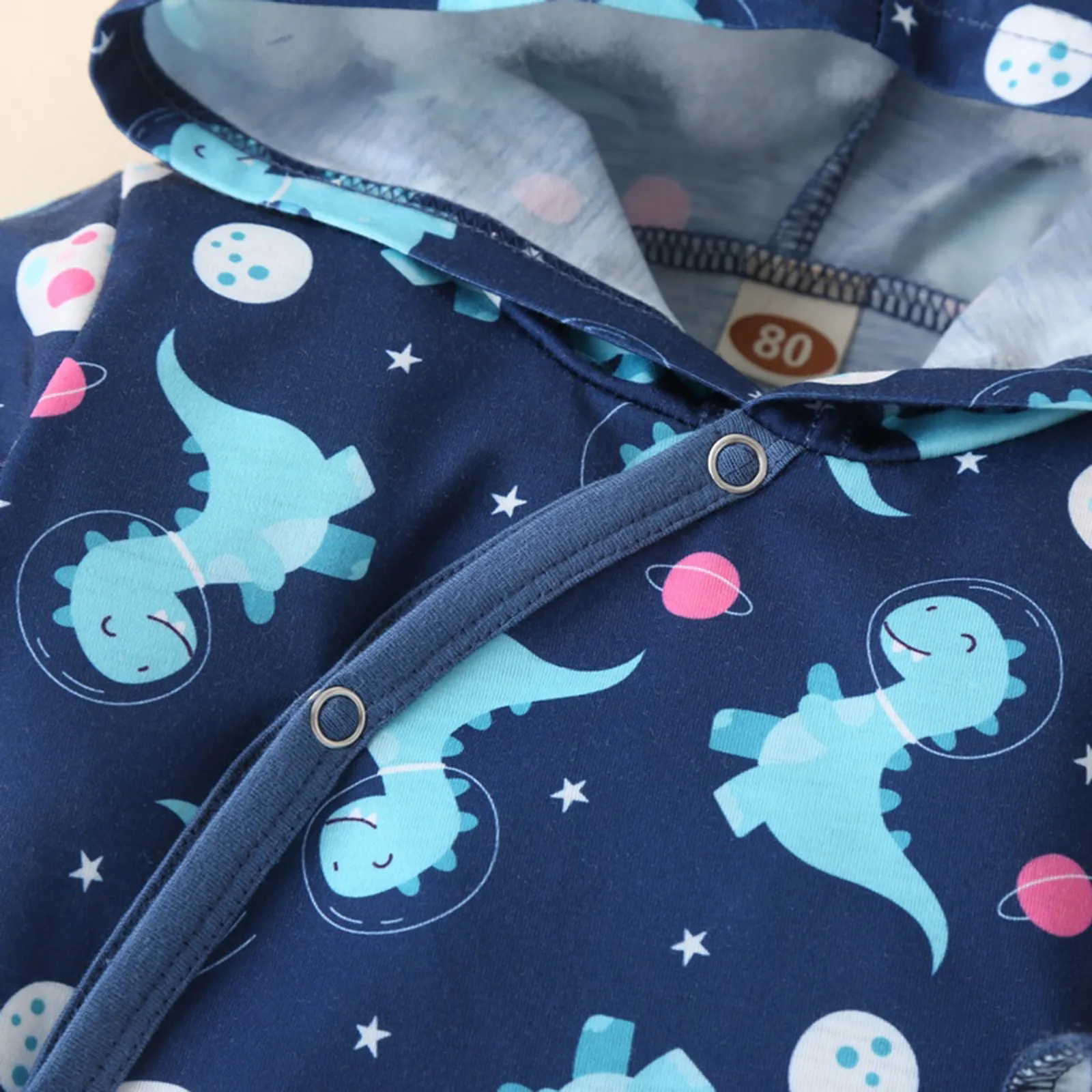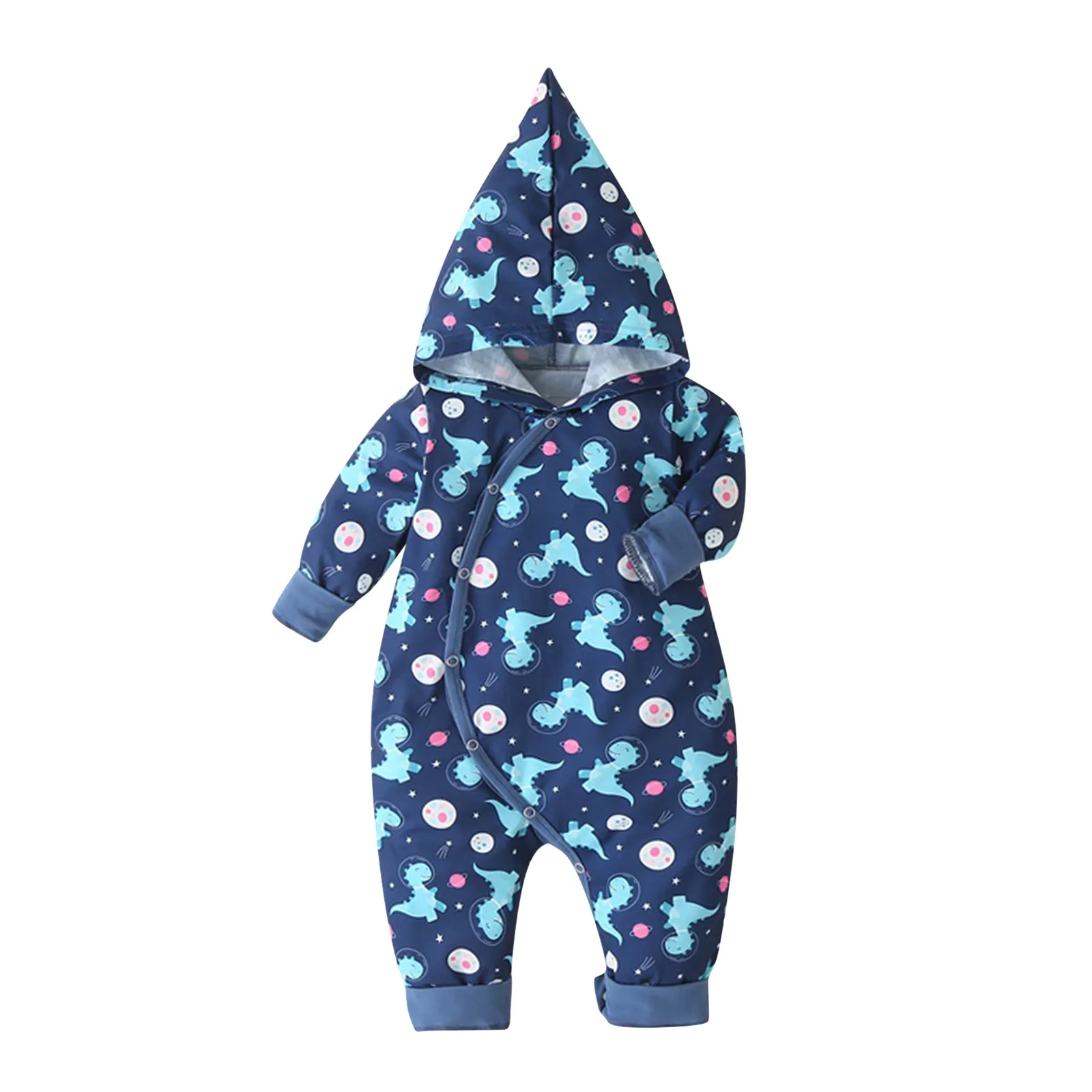Одежда для новорожденных мальчиков и девочек, комбинезон с принтом динозавра из мультфильма, комбинезон с длинными рукавами и капюшоном для 3, 6, 9, 12, 18 месяцев, пижама, bebe garcon