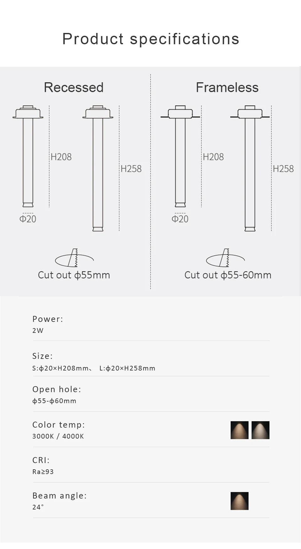 2 Вт угол луча 24 ° вырезанный φ55-60мм