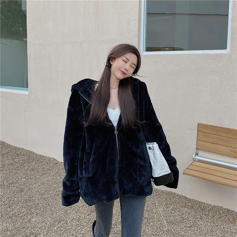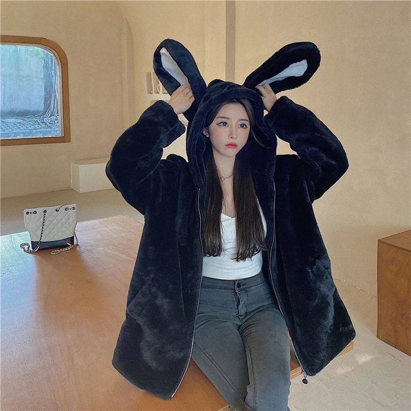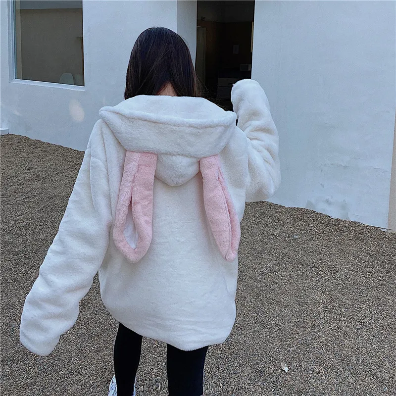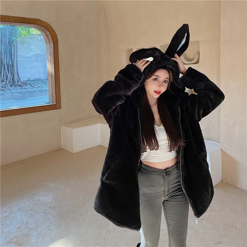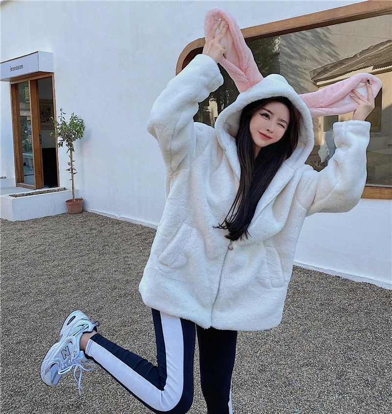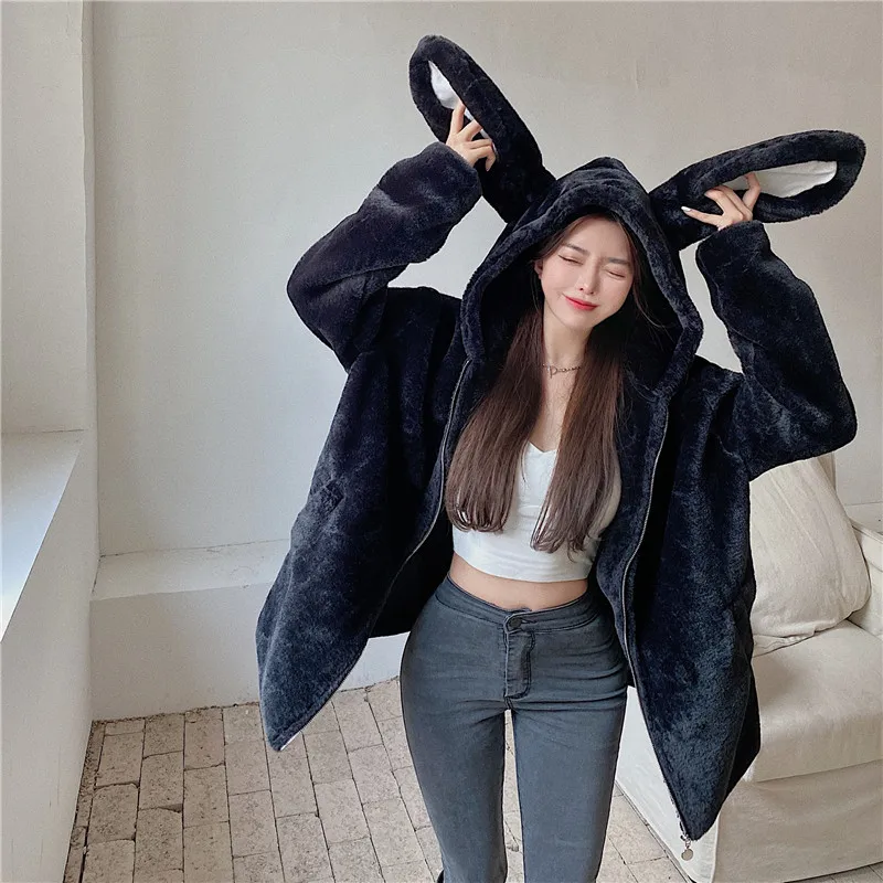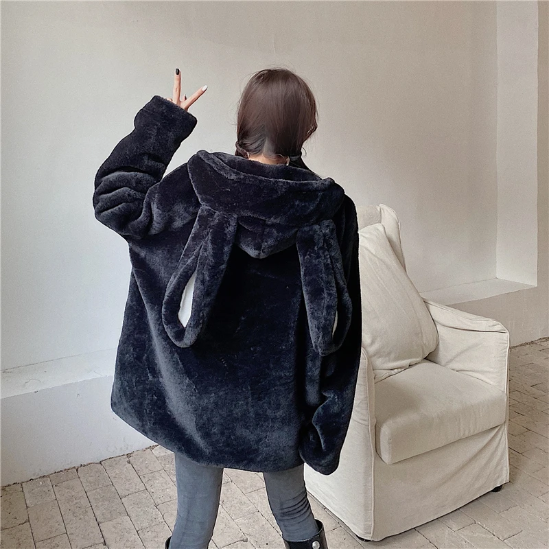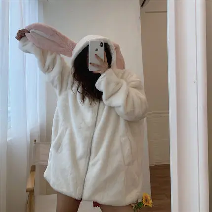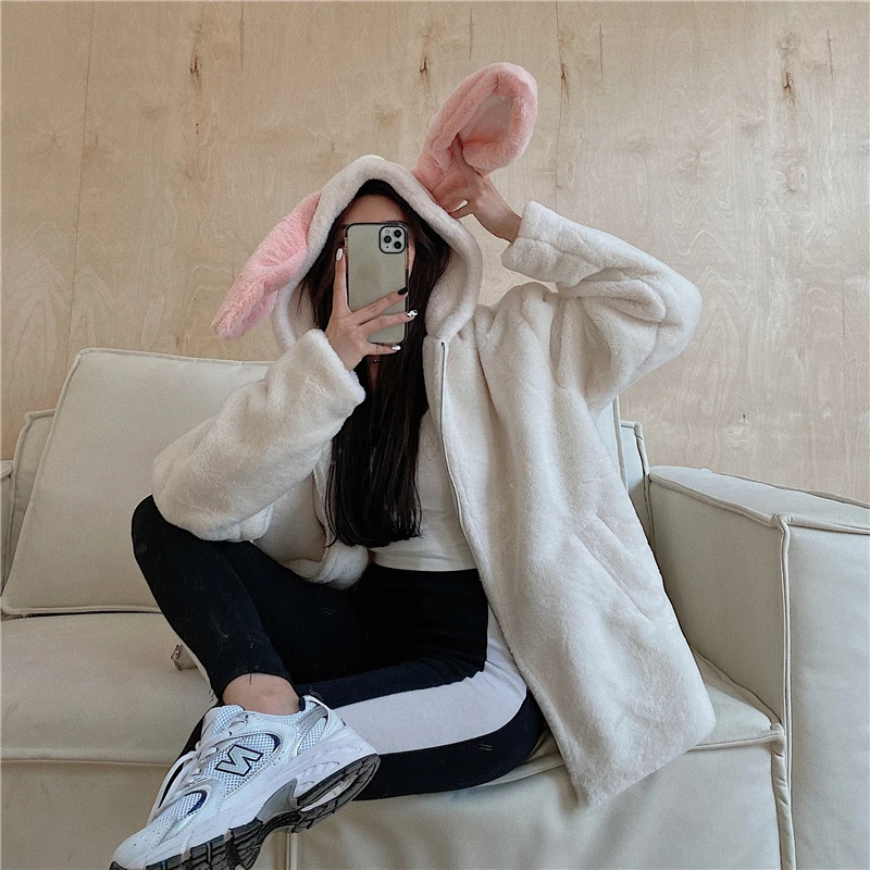 Милое милое плотное пальто в японском стиле однотонные куртки большого размера Женская зимняя женская одежда с капюшоном и кроличьими ушками 2020