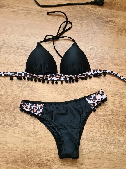 Доставка 2 недели. Я заказала маркировку М на параметры 85-70-90, рост 163см - отлично подошло. Купальник раздельный. Верх на завязках. Чашечки с эффектом пуш-ап, очень удобные. По нижнему краю леопардовая вставка с помпонами. Трусики классические. Также имеют контрастные вставки. Посадка средняя. Гигиеническая наклейка присутствовала. Качество отличное. Дефектов не было. Придраться не к чему. Купальник мне очень понравился. Удобный, красивый. Смотрится хорошо, есть своя изюминка. Смело советую.