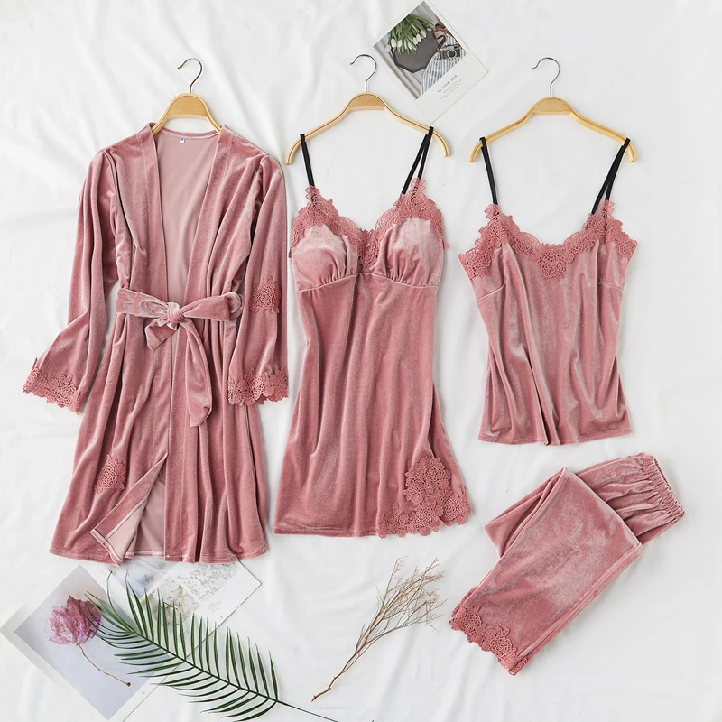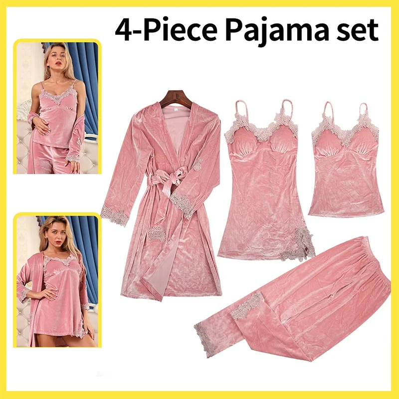 Комплект из 4 предметов, Женская пижама, топ для сна, халаты, домашняя одежда, пижама, платье, нижнее белье, теплые зимние комплекты