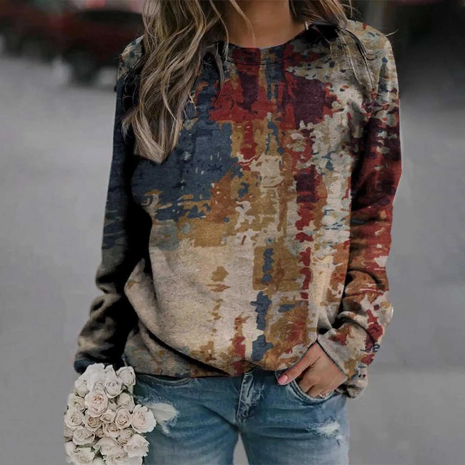 Женские повседневные свитшоты с принтом, теплые футболки с круглым вырезом и длинным рукавом, свободные удобные топы-туники
