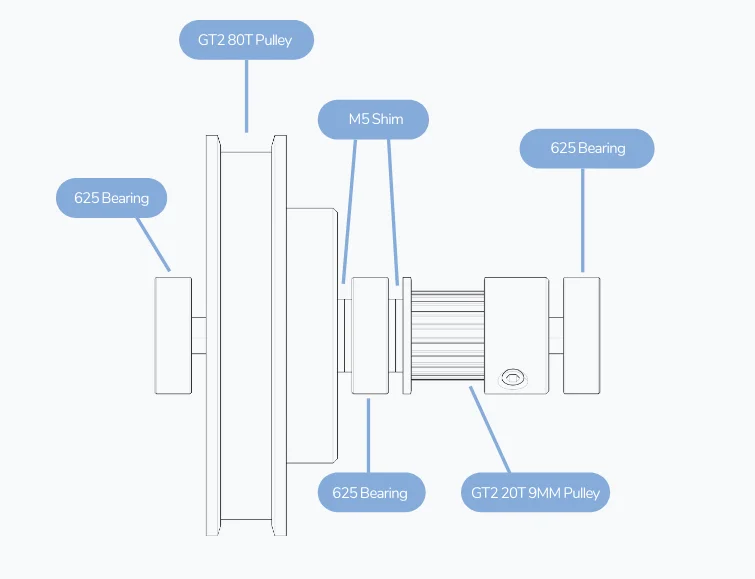 5x60 мм шлифовальный плоский Вал ---- 1 шт.625 2RS Подшипники ---- 3 шт.80 зубьев 2GT отверстие шкива 5 мм для ширины ремня 6 мм ----- 1 шт.20 зубьев 2GT отверстие шкива 5 мм для ширины ремня 6 мм/9 мм ------ 1 шт.Петля для ремня GATES 188-2GT-6 RF GT2 (ширина 6 мм) --- 1 шт.