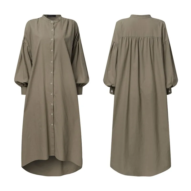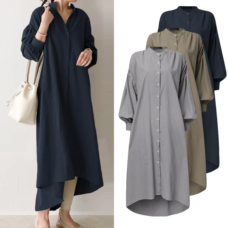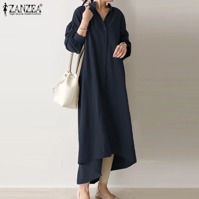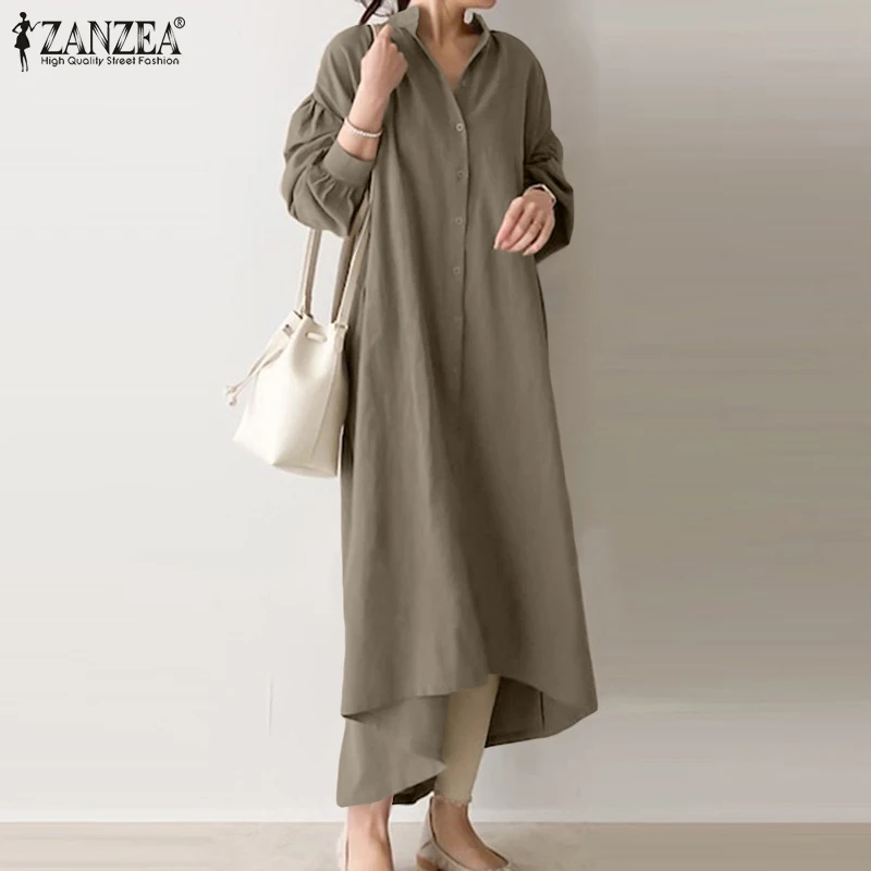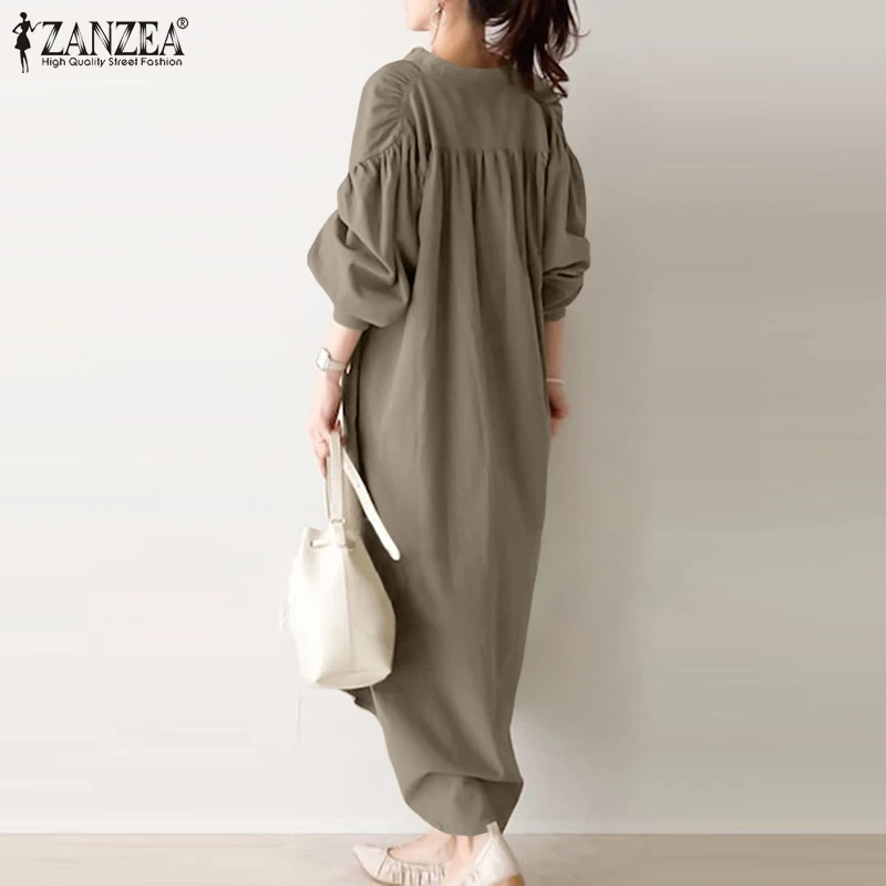 Элегантное однотонное платье-рубашка, Женский Осенний сарафан ZANZEA 2021, Повседневное платье миди с пышными рукавами, женское платье на пуговицах