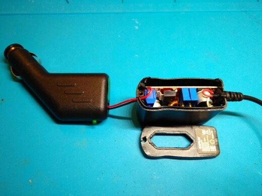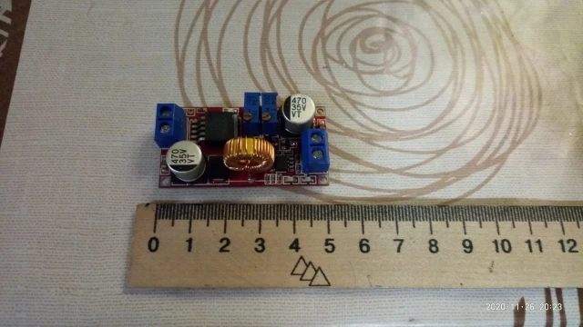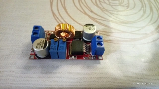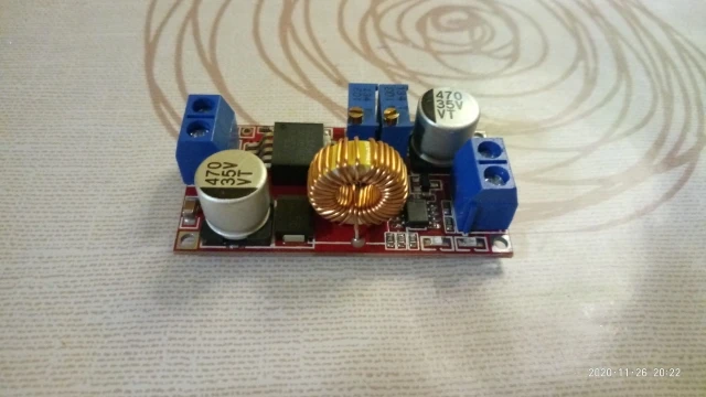 Пришла плата за 15 дней. Брал для видеорегистратора, блок питания которого давал наводки на радио. Подключение простое, вход и выход подписаны, через клеммники, главное не перепутать полярность. Напряжение подстраивается переменным резистором, указан стрелкой. Проверка тестером. Рядом стоящий резистор для регулировки силы тока. Значения по току установил по работе видеорегистратора, при малом токе моргал экран, т.е. прибавлял величину до стабильной работы. Под корпус взял старое зарядное устройство от давно ушедшего планшета, отрезал выводы 220 в, влез как родной. Оставшееся отверстие пока не заделывал, оставил для вентиляции, т.к. элементы стабилизатора могут сильно нагреваться. Посмотрю дальше в процессе эксплуатации. Кто-то устанавливает стабилизатор в плафон, как вариант, т.е. питание от подсветки салона. На плате есть три светодиода, всё красные, хотя должны быть разноцветные. Их предназначение так и не понял. В целом работает, можно брать.