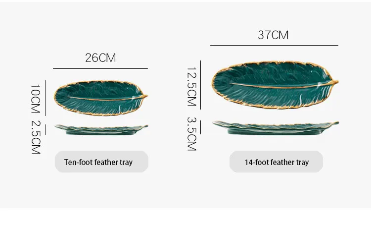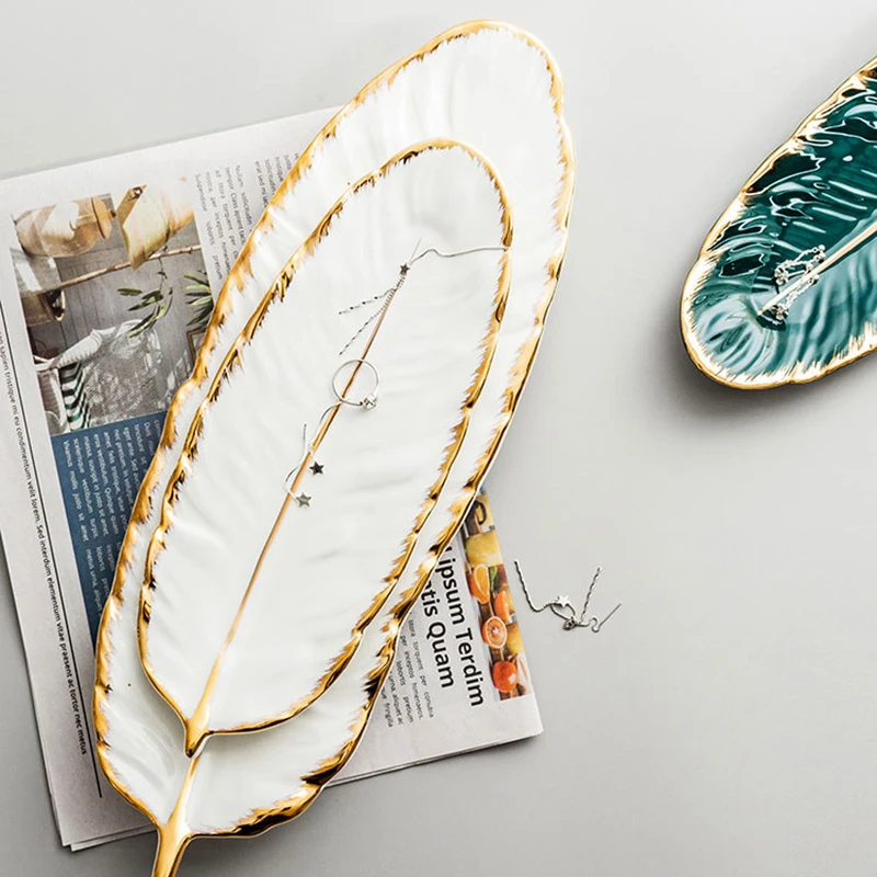 Блестящая глазурованная керамическая тарелка белого цвета в форме листа с золотым ободом, ювелирные изделия, десертные блюда, косметическое кольцо, поднос с перьями