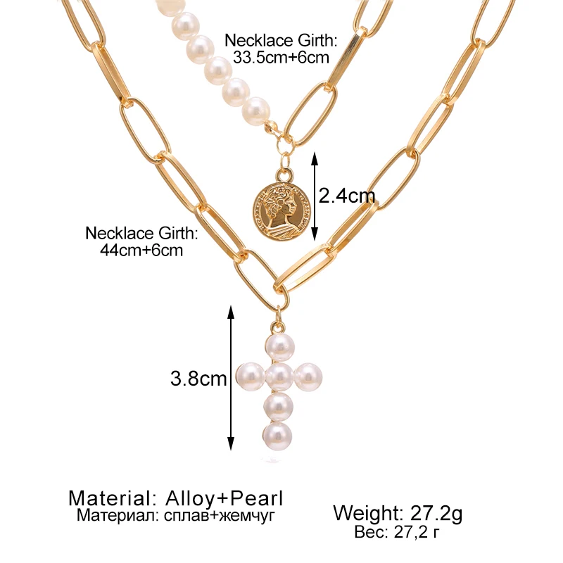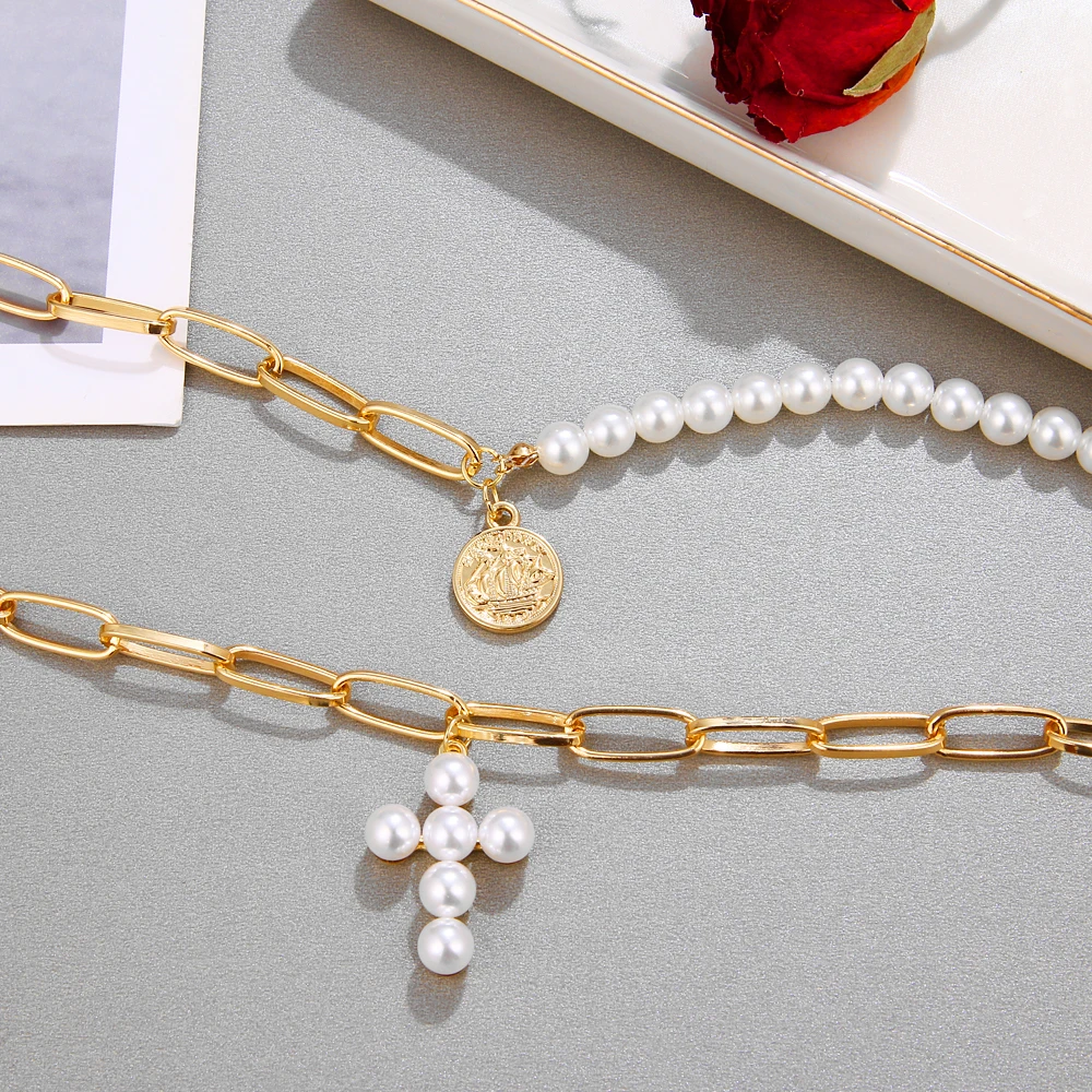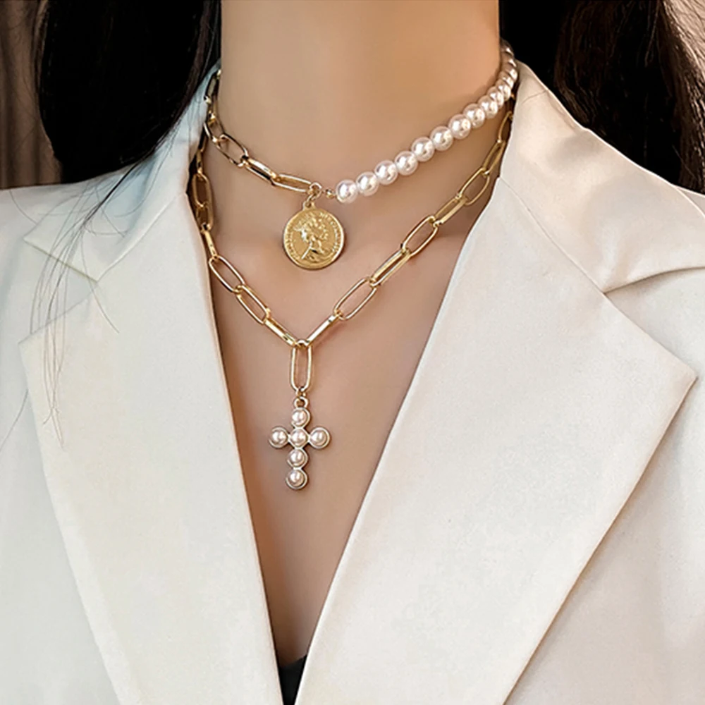 Чокер IPARAM в богемном стиле Женский, ожерелье с жемчужной монета с крестом, массивная цепь геометрического дизайна в стиле ретро, Ювелирное Украшение для ожерелье длиной до ключиц с подвесками