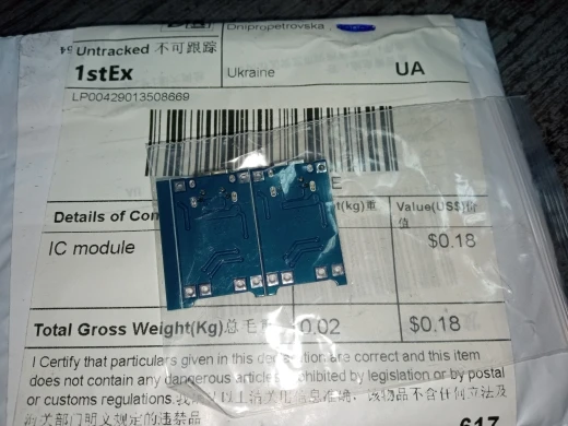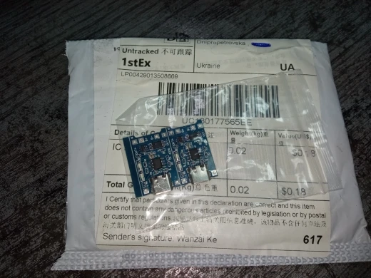 Страна: RU Color: TP4056 micro Доставка: Cainiao Super Economy 04.01.2021