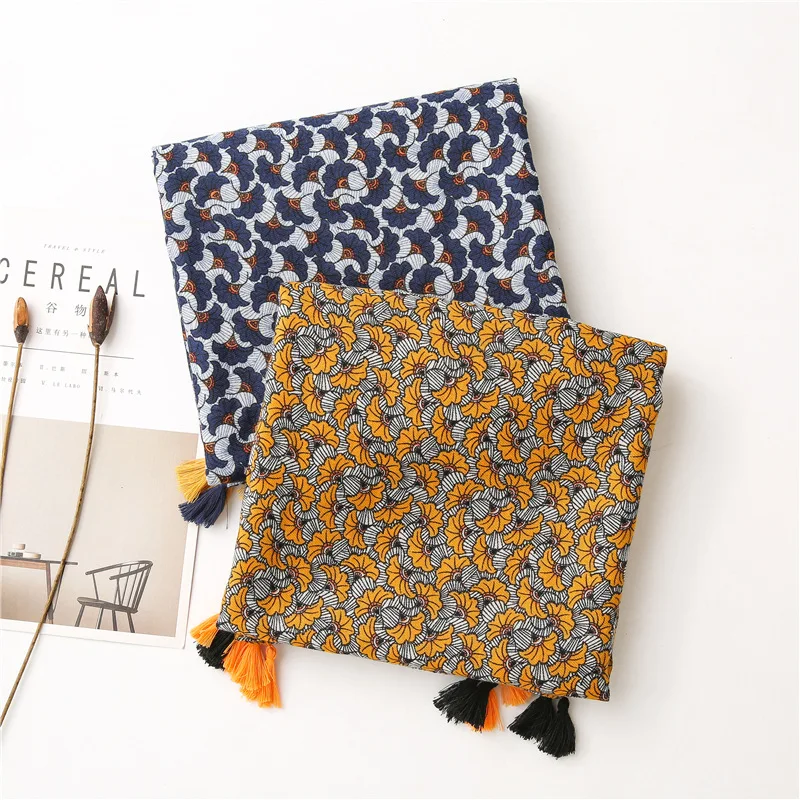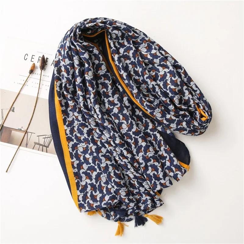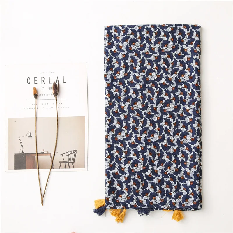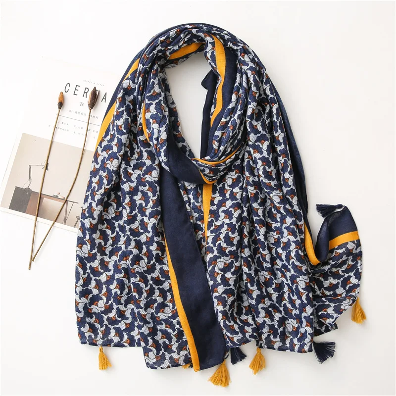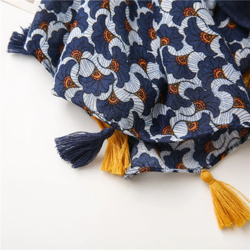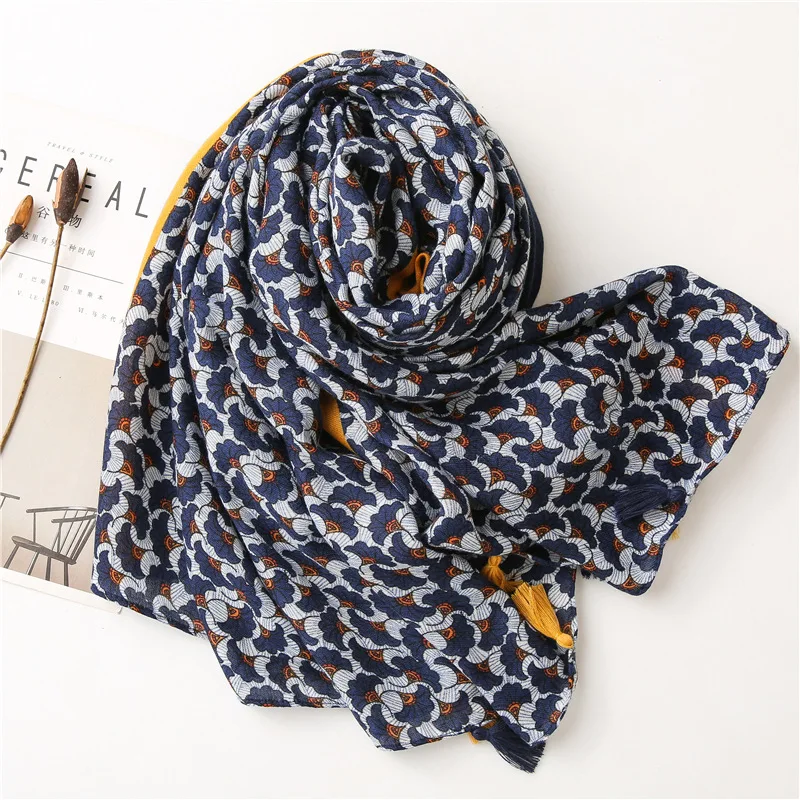 Повязка на голову женская темно-синяя с лепестками и кисточками, шаль из вискозы х 90 см, Осенний шарф, мусульманский хиджаб 180 х 90 см