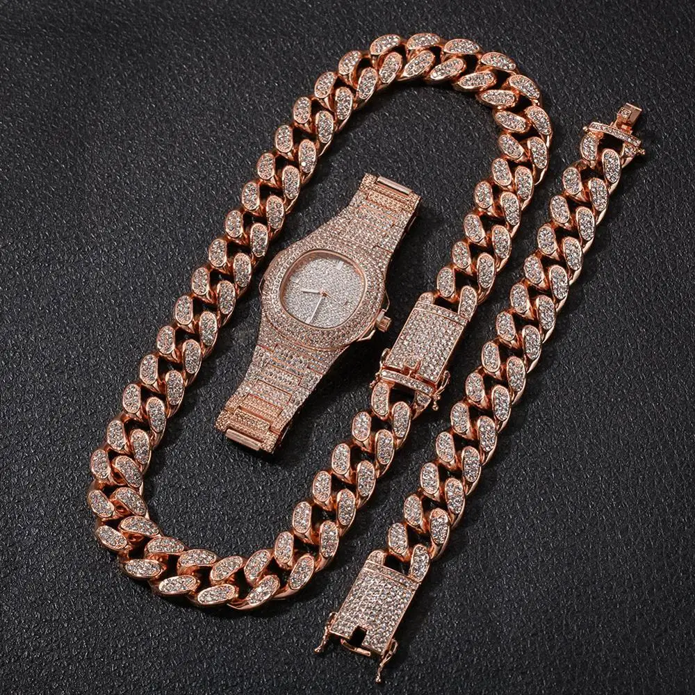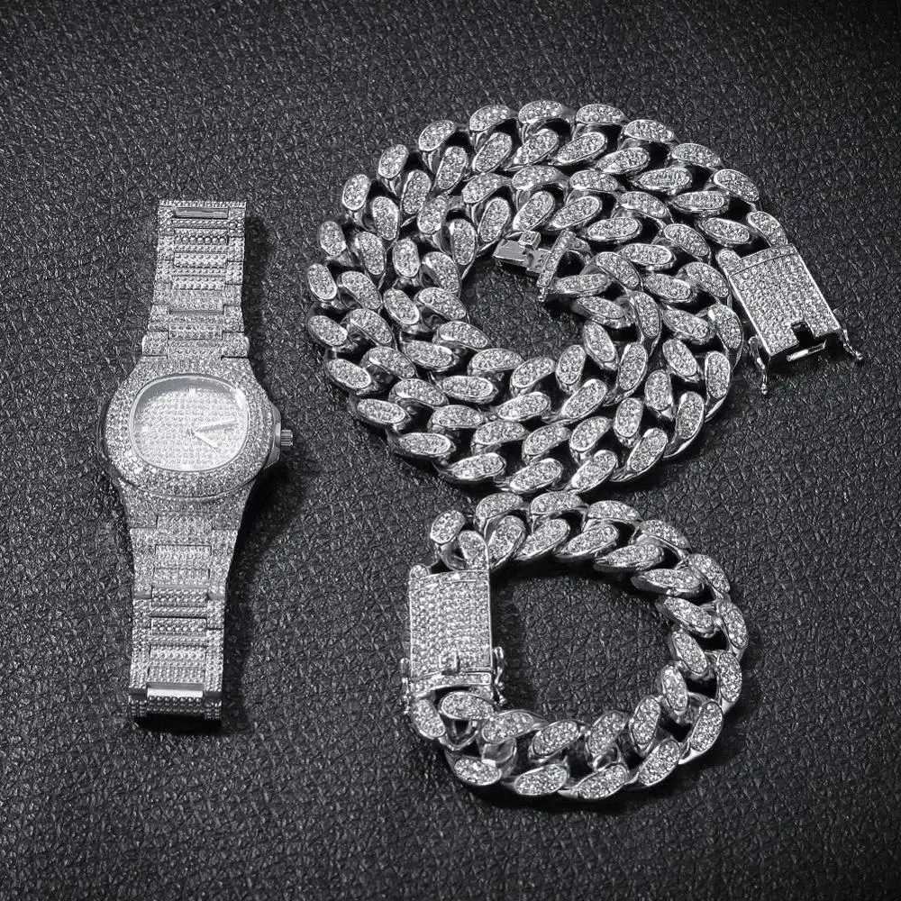 Набор из колье + часы + браслет AITIEI, кубинская цепочка Майами, стразы с камнями, украшения для мужчин, хип-хоп