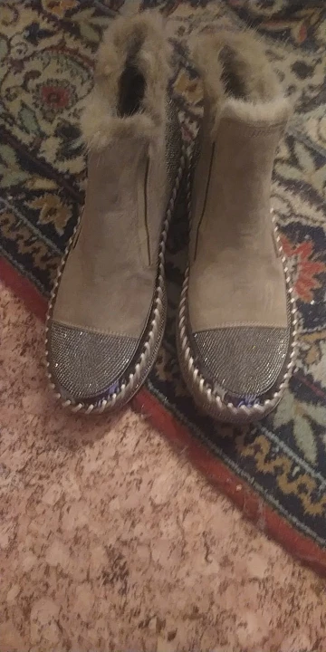 очень красивые!!! не люблю блеск, но эти-вне конкуренции. на 39,5-40 размер 12 впритык, носок не оденешь, четко длина 26,5 см. снаружи мех натуральный, внутри синтетический флис. есть небольшой запах. думаю, нога будет потеть. но очень понравились, необычные. рекомендую!!!