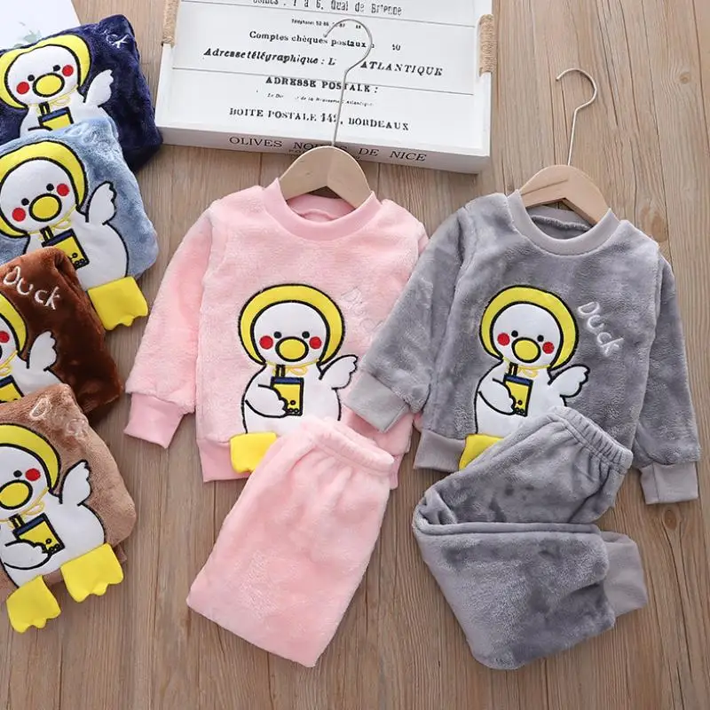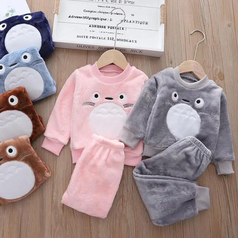 Новые зимние детские пижамы с вышитыми персонажами из мультфильмов Длинный топ и штаны для мальчиков, плотная теплая фланелевая одежда для сна флисовая домашняя одежда для девочек, От 0 до 6 лет