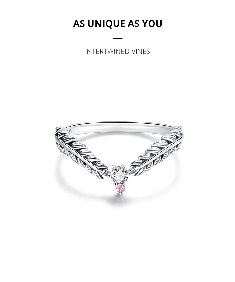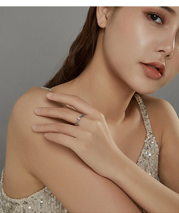 Ширина: 0,2 смS925 + окисленное серебро + паве установка CZПереплетенные лозы усеяны сверкающими цирконами, создавая элегантный темперамент между пальцами.