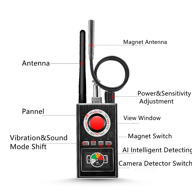Возможность обнаружения sim-карты (2G, 3G, 4G) ошибки/GPS трекеры Возможность обнаружения оборудования беспроводной камеры от 1,2G-5,8G Возможность обнаружения скрытого оборудования в режиме ожидания Простота в эксплуатации/переноске Использует звук, светильник и вибрации, чтобы оповещать пользователей о скрытом устройстве Возможность обнаружения радиоволн, магнитных полей и проводных/беспроводных камер
