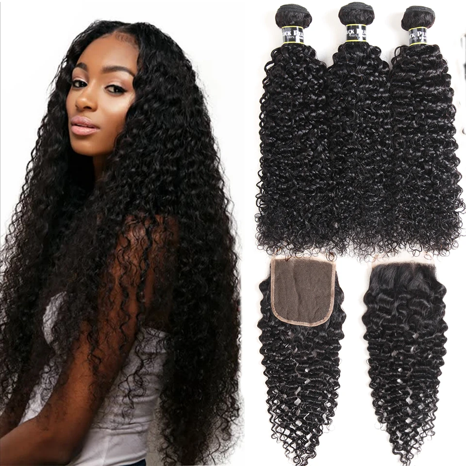 Черные перламутровые кудрявые 3 пряди с закрытием Remy человеческие волосы плетение для наращивания бразильские вьющиеся волосы пряди с закрытием