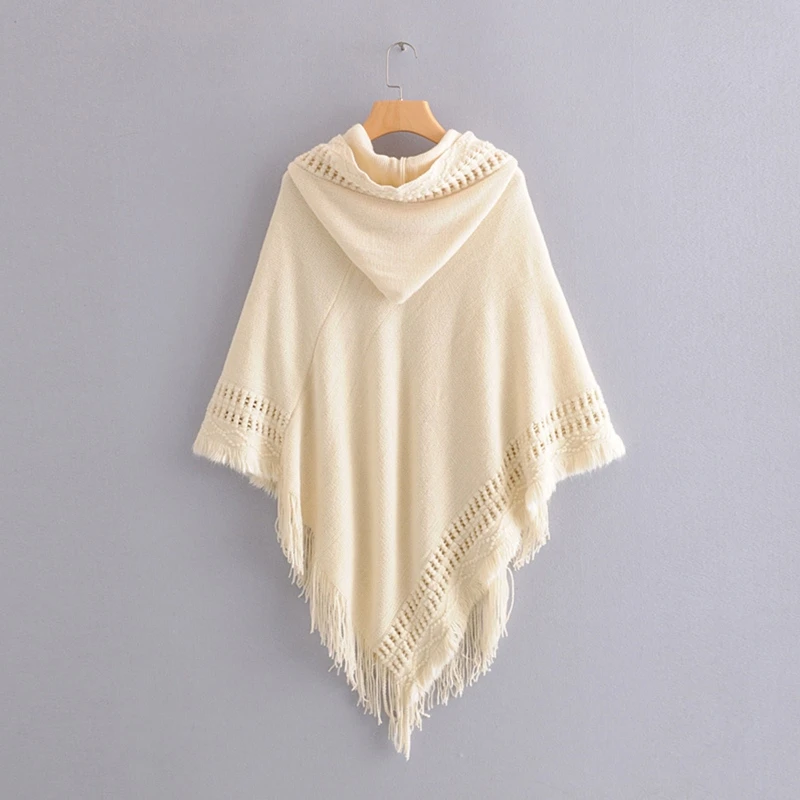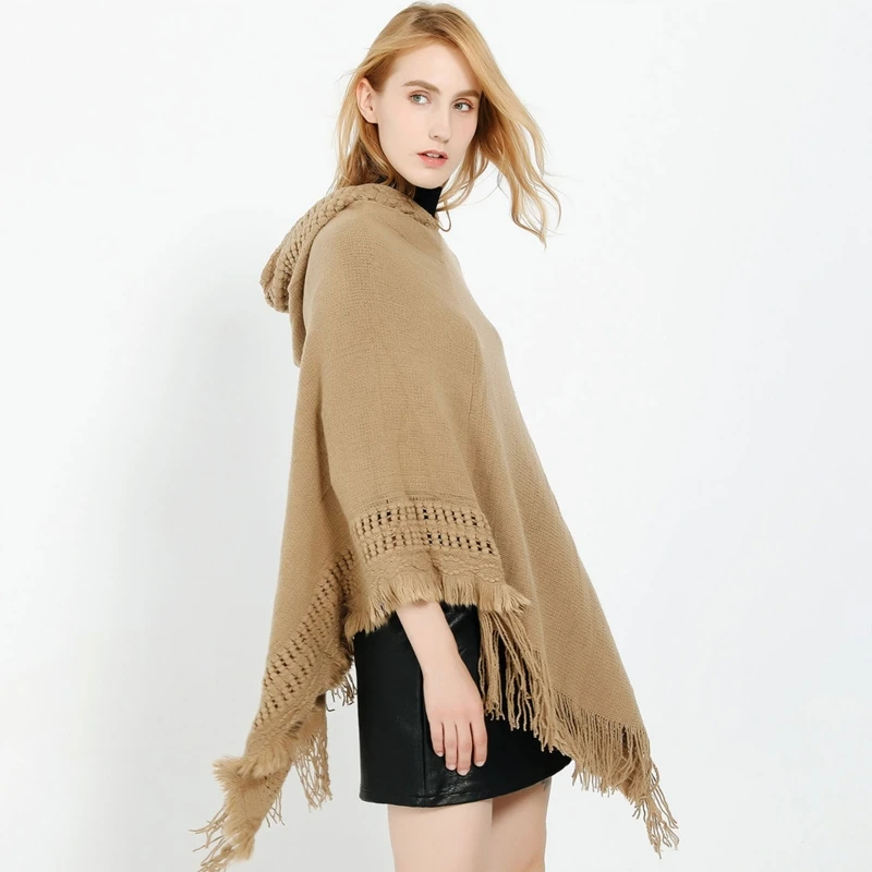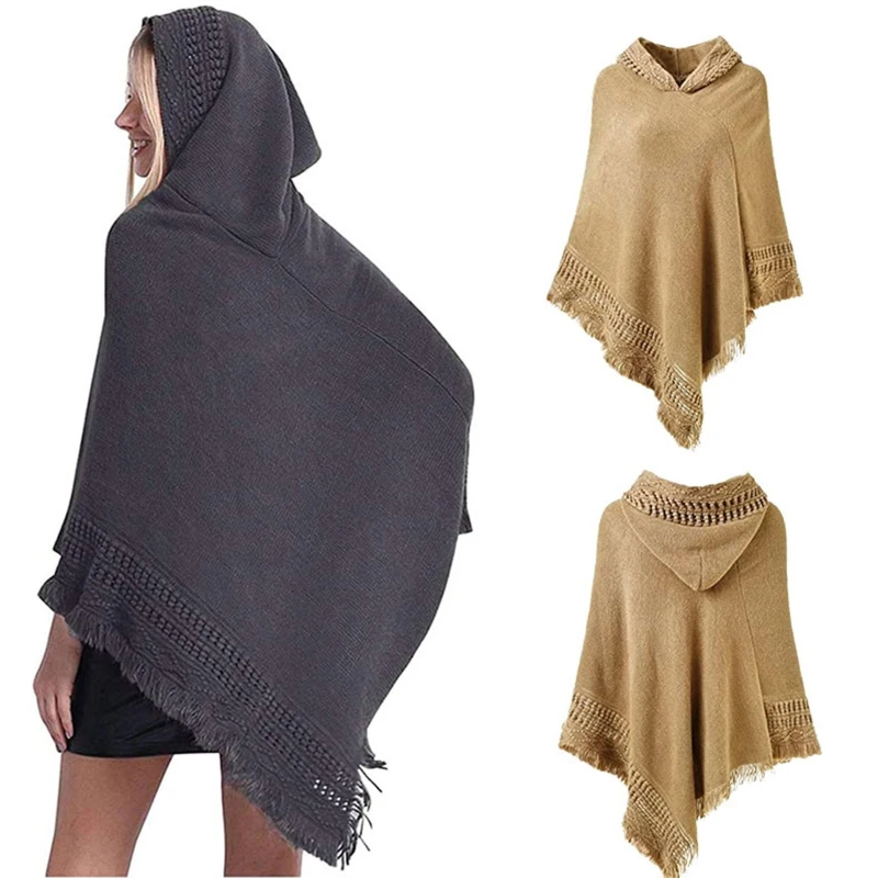 Женское зимнее Вязаное пончо с капюшоном, однотонное вязаное крючком шалевая накидка с бахромой в виде кисточек с бахромой, свитер-накидка большого размера