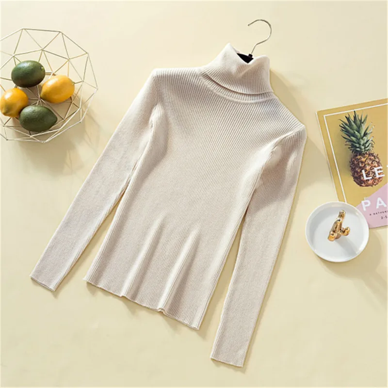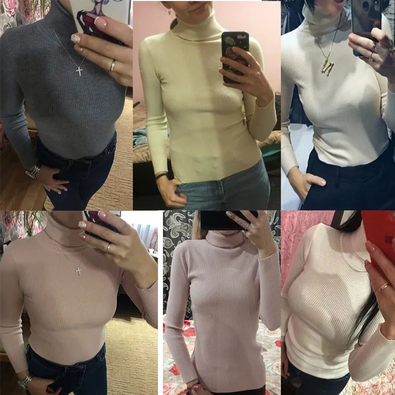 Свитер женский трикотажный однотонный с высоким воротом и длинным рукавом, Осень-зима 2020