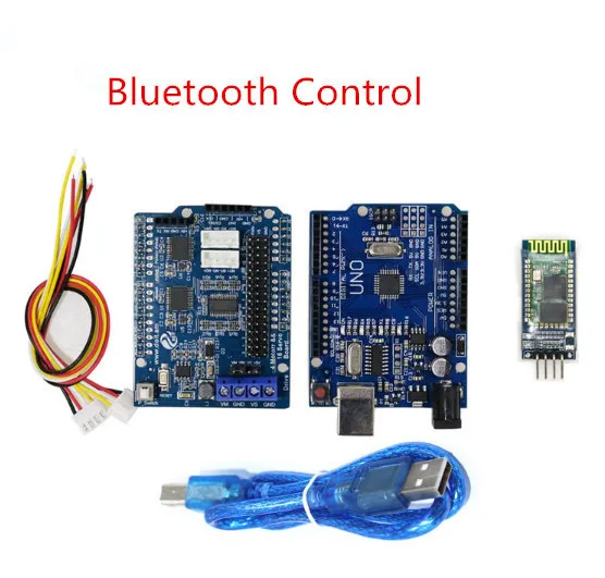 Комплект управления Bluetooth = 1 модуль bluetooth HC-06 + 1 плата UNO R3 + 1 плата драйвера двигателя + 1 кабель USB + 2 провода двигателя