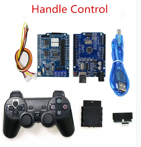 Комплект управления рукояткой = 1 ручка PS2 + 1 приемник + 1 плата UNO R3 + 1 плата драйвера двигателя + 1 кабель USB + 2 провода двигателя