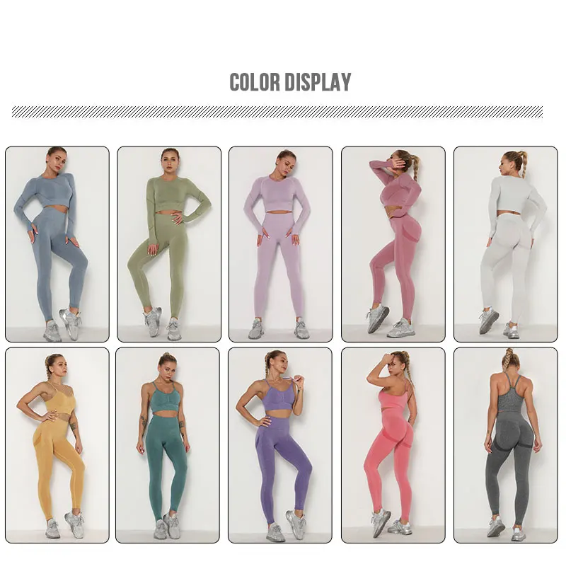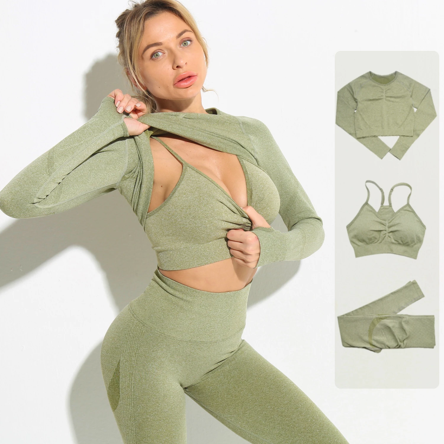 Комплект Спортивный бесшовный для женщин, укороченный Топ с длинным рукавом и леггинсы с высокой талией и бюстгальтер спортивный костюм женск костюм для фитнеса спортивный костюм фитнес костюм женский